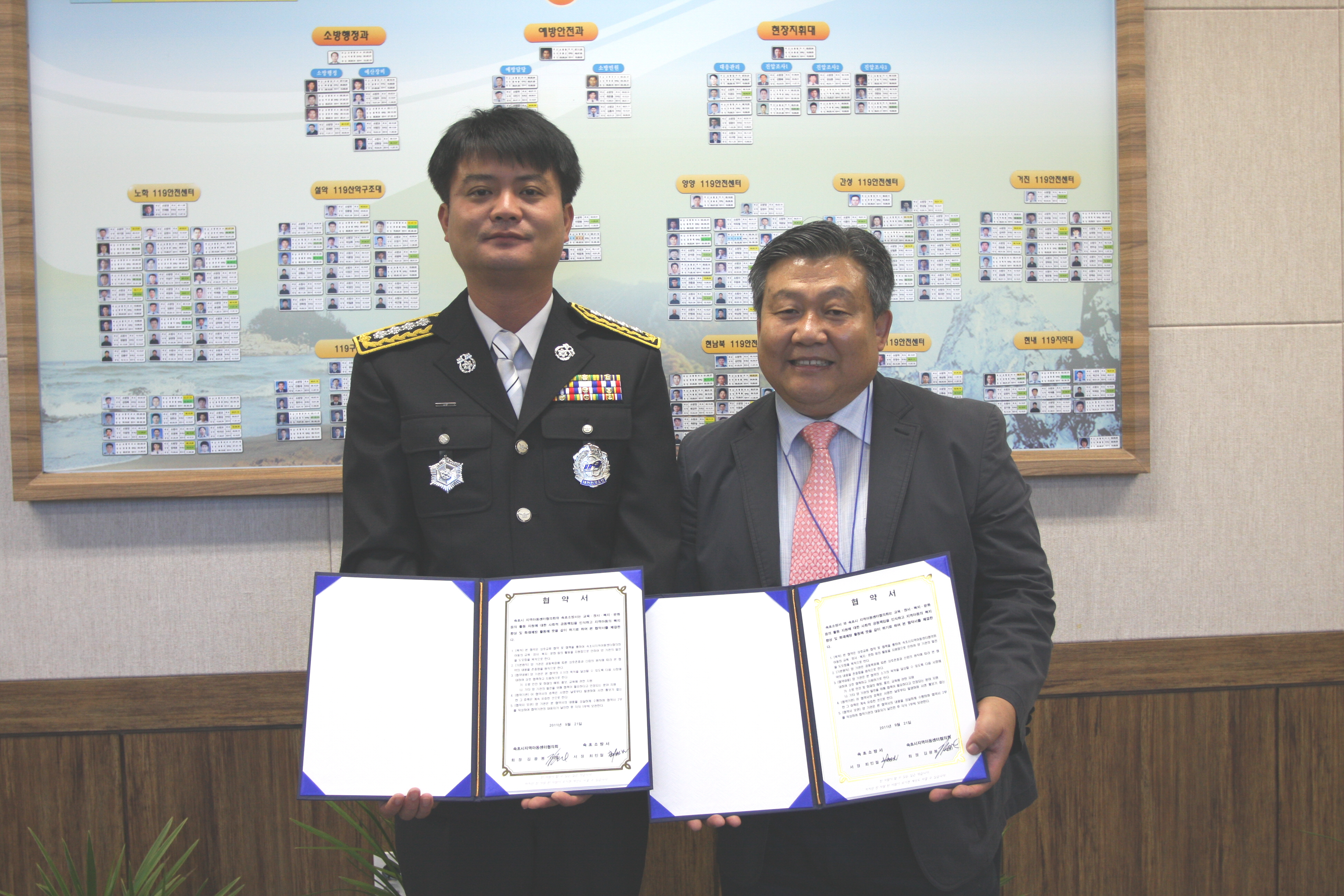 협약 내용은 소방 안전 및 화재의 예방, 홍보, 교육에 관한 지원 및 기타 아동복지에 관한 사항 등이다.