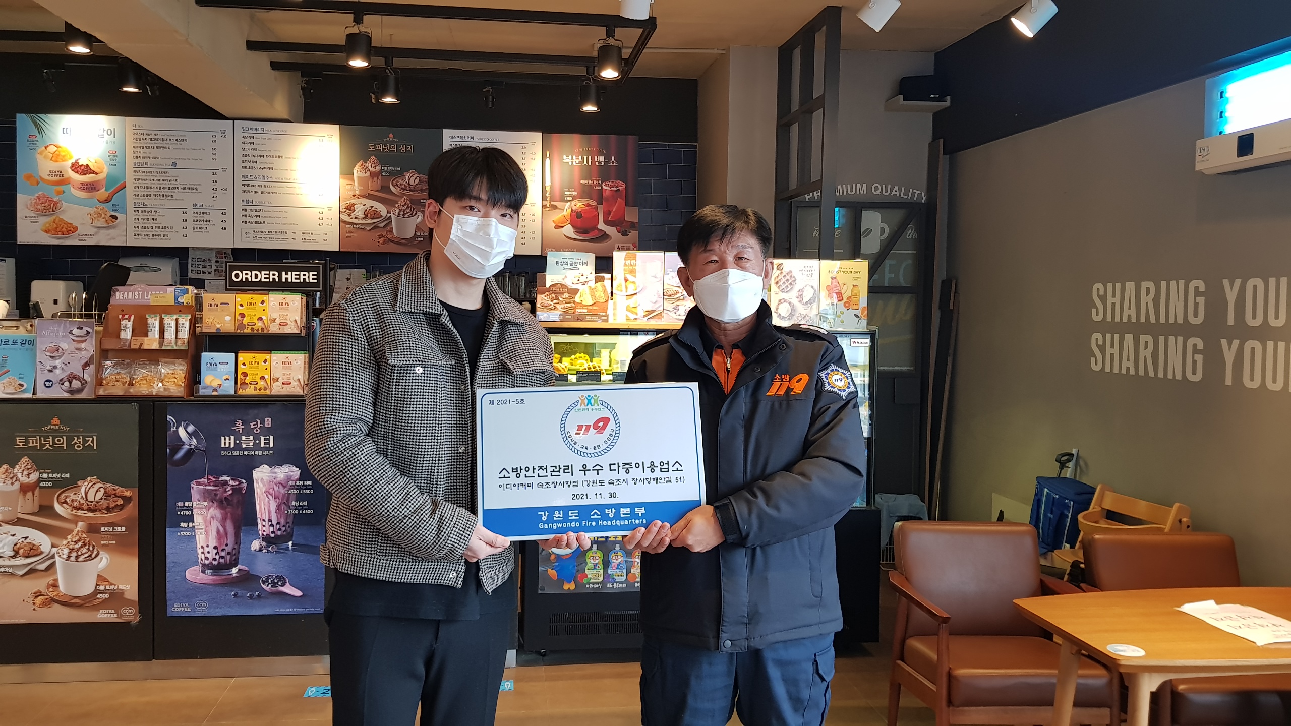 속초소방서(서장 김재석)는 2021년 11월 30일 소방안전관리 다중이용업소 우수업소로 선정된 이디야커피 속초장사항점 (장사항해안길 51)에 방문해 안전관리 우수업소 전수식을 가졌습니다.