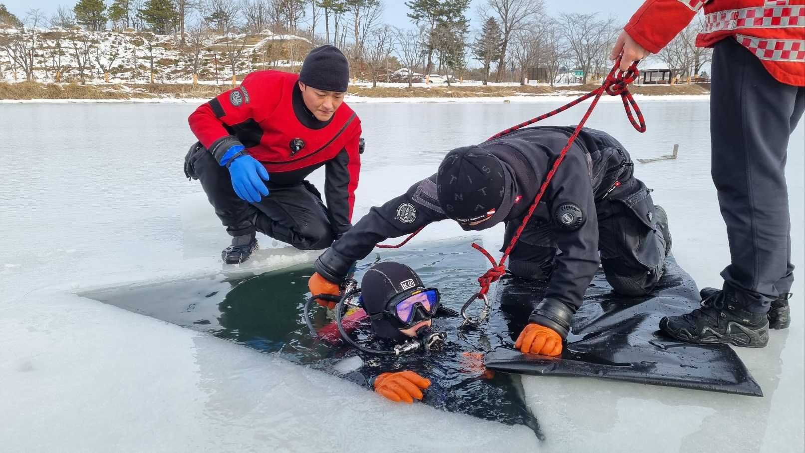 훈련 내용으로는 ▲빙상사고 대비 인명구조훈련 ▲ 2인1조 수중 수색구조법 훈련 ▲ 각종 상황에 맞는 요구조자 안전확보훈련 등 이다.