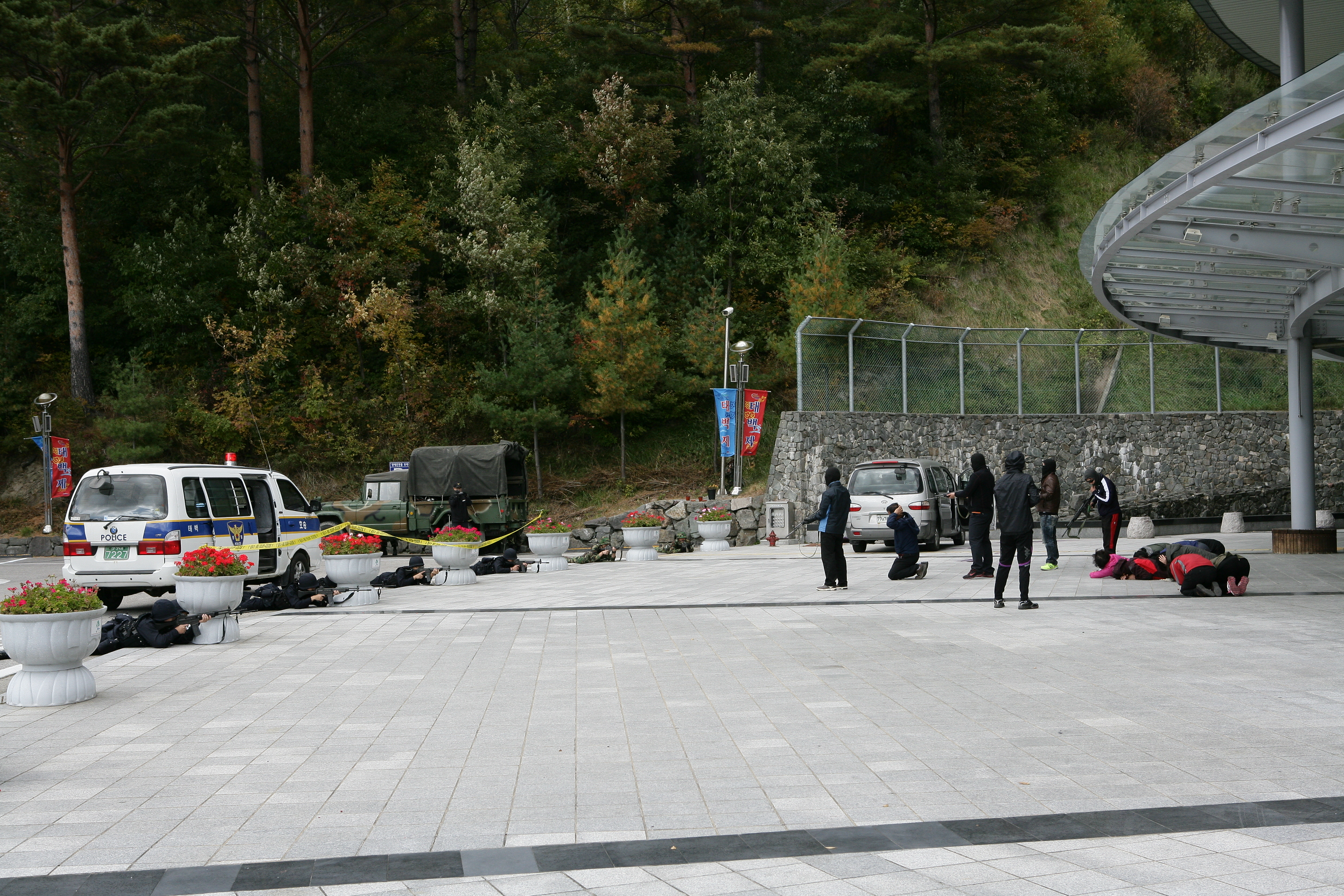태백소방서(서장 김진봉)는 2012.10.11(목) 14:00 태백시 고원실내체육관에서 테러에 의한 폭발,화재발생 등 재난대비 긴급구조종합훈련을 실시하였다. 이번 훈련은 태백소방서,태백시청,경찰,군부대 등 17개 유관기관,단체 등 269명과 장비 42대가 동원된 가운데 인질,폭발,화재등 대테러 종합대응 훈련으로 진행됐다.
