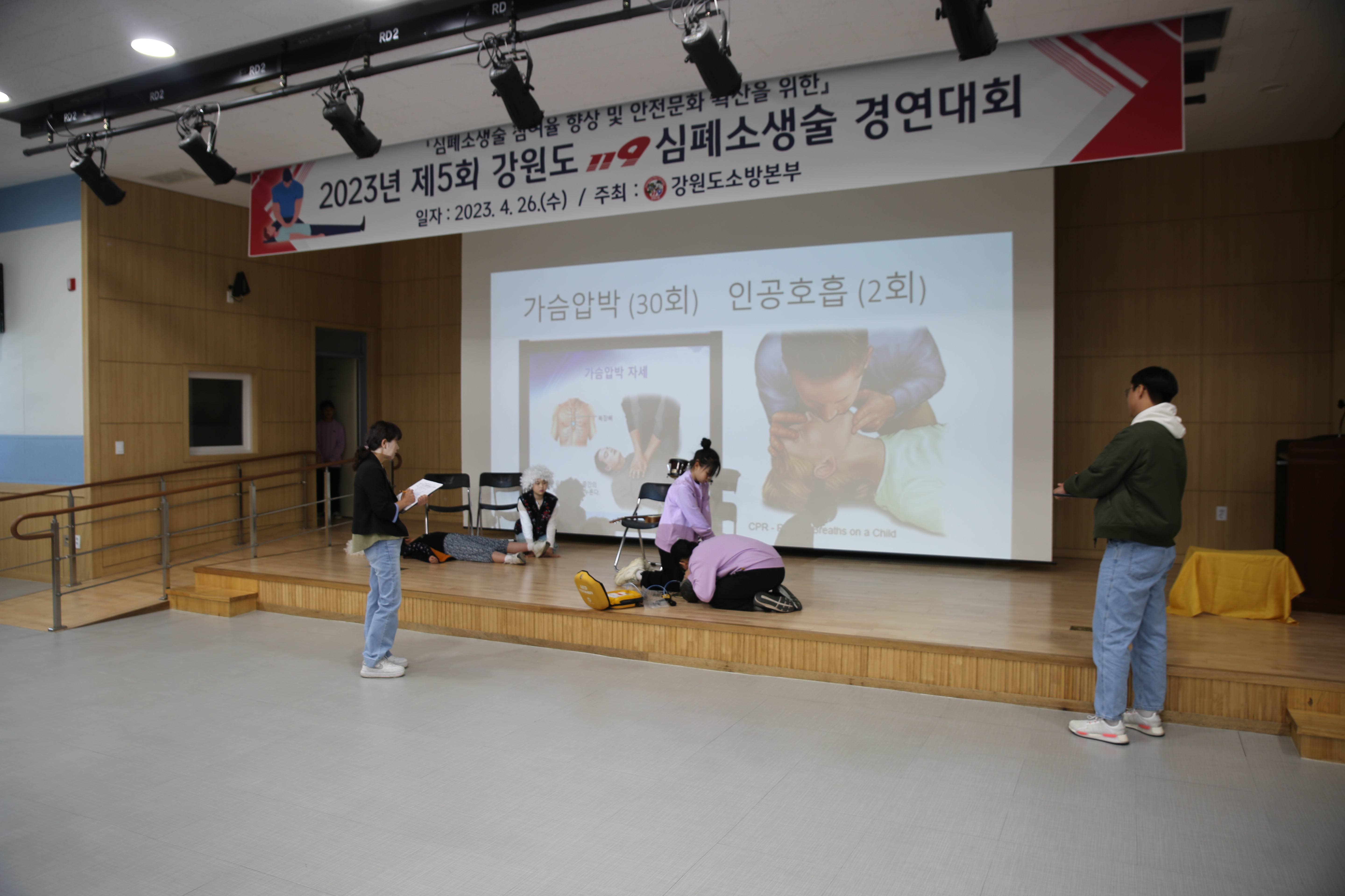 원주소방서 대회의실에서 열린 이날 대회에 강원도 18개 소방서에서 선발된 대표팀이 참가해 짧은 연극을 통해 표현한 퍼포먼스 형식으로 심폐소생술을 경연했다.