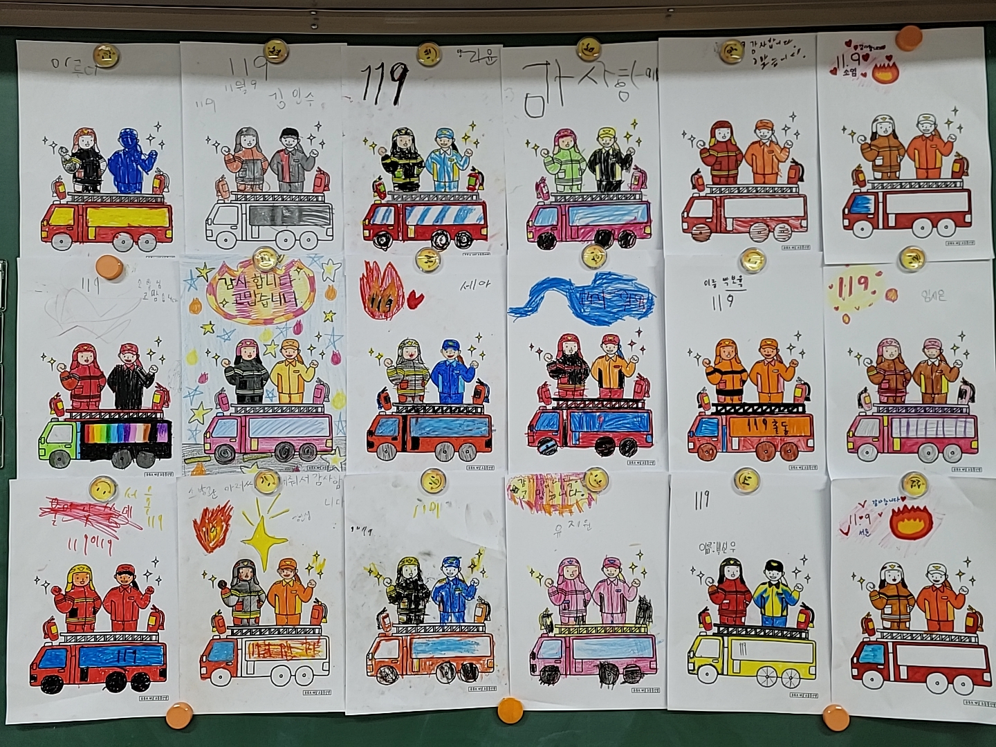 소방의 날을 맞이하여 1학년 아이들이 소방관련 일하시는 모든 분들께 감사하는 마음을 나타내는 그림과 글을 만들었습니다.
