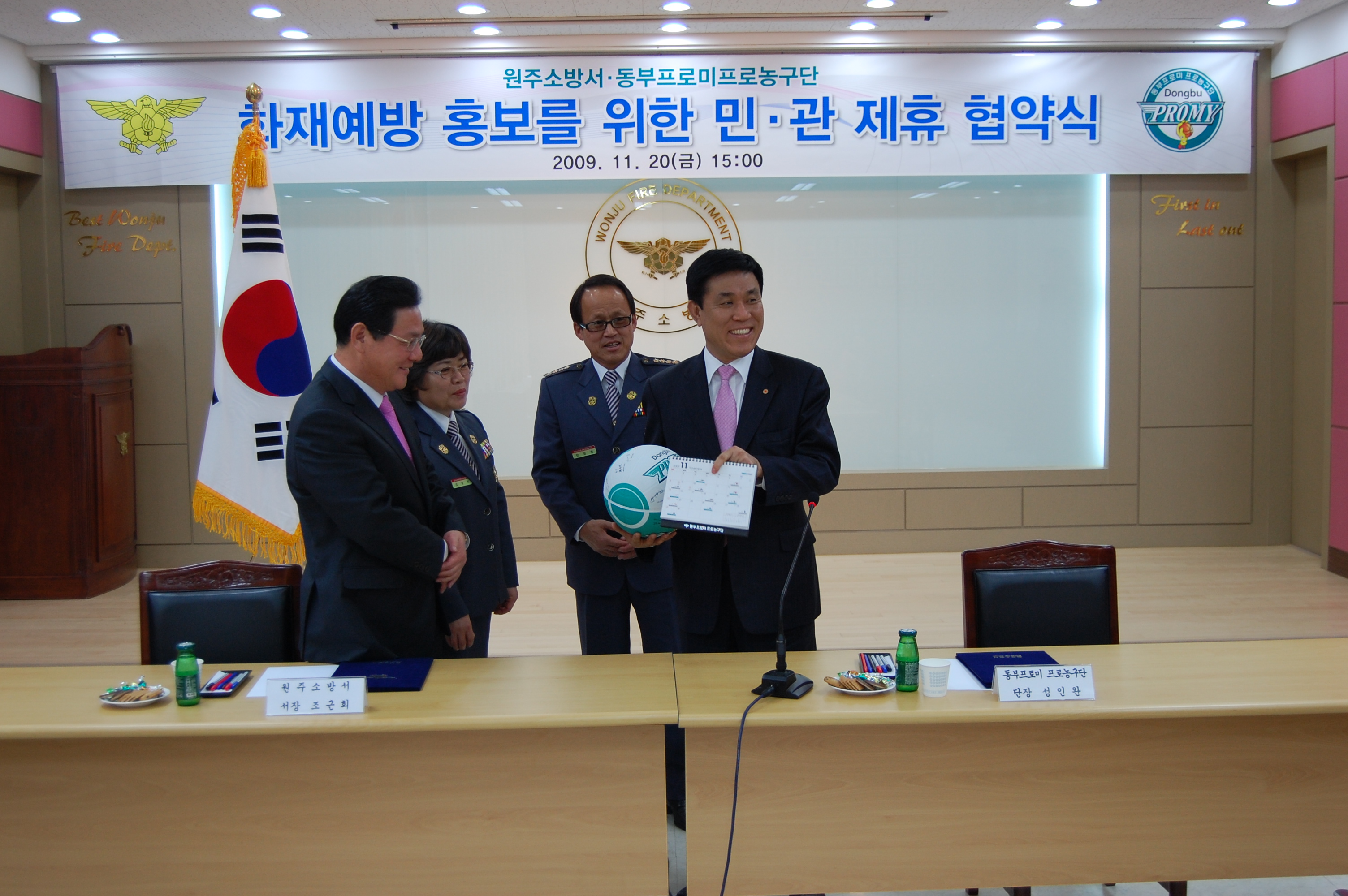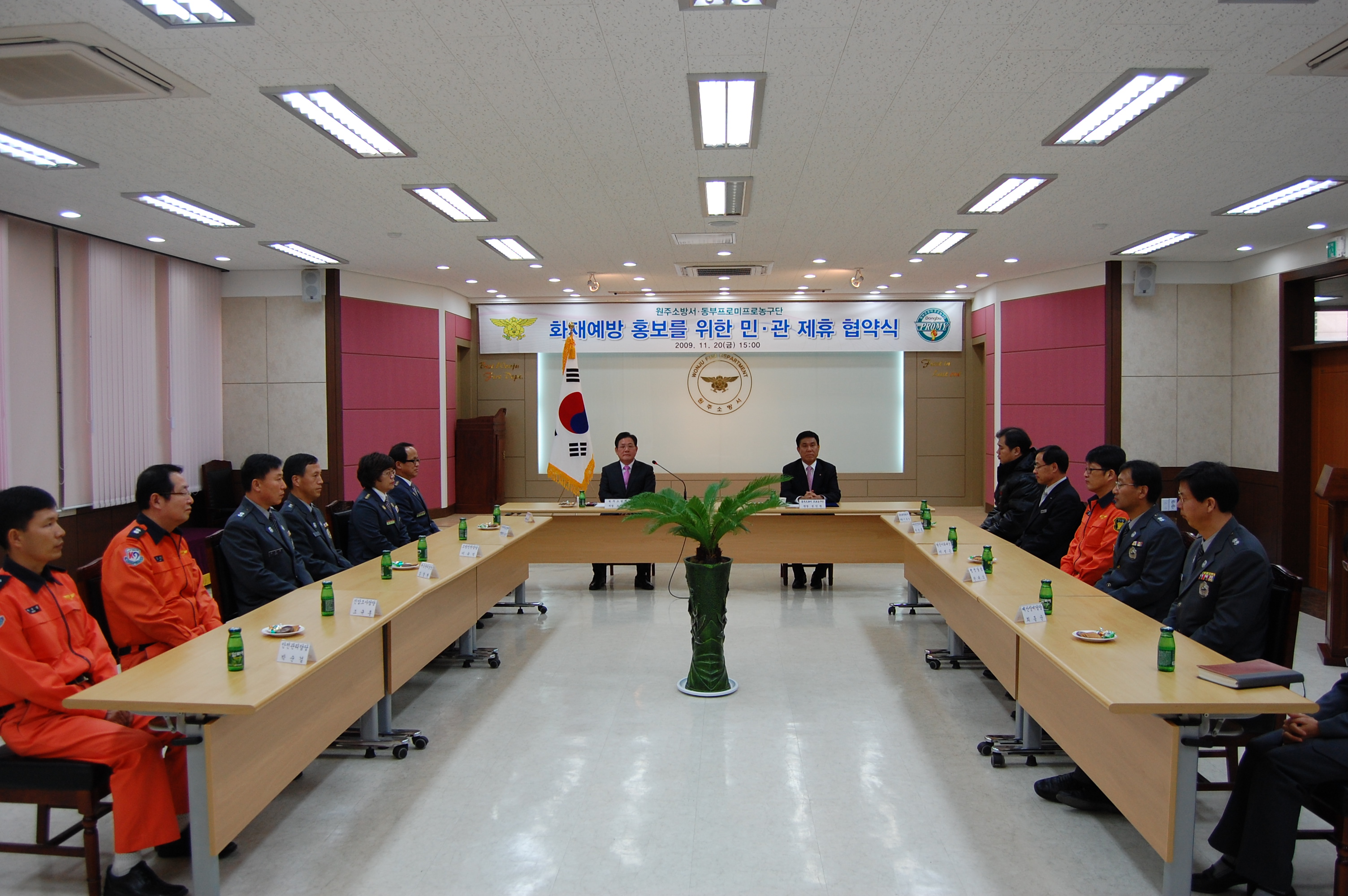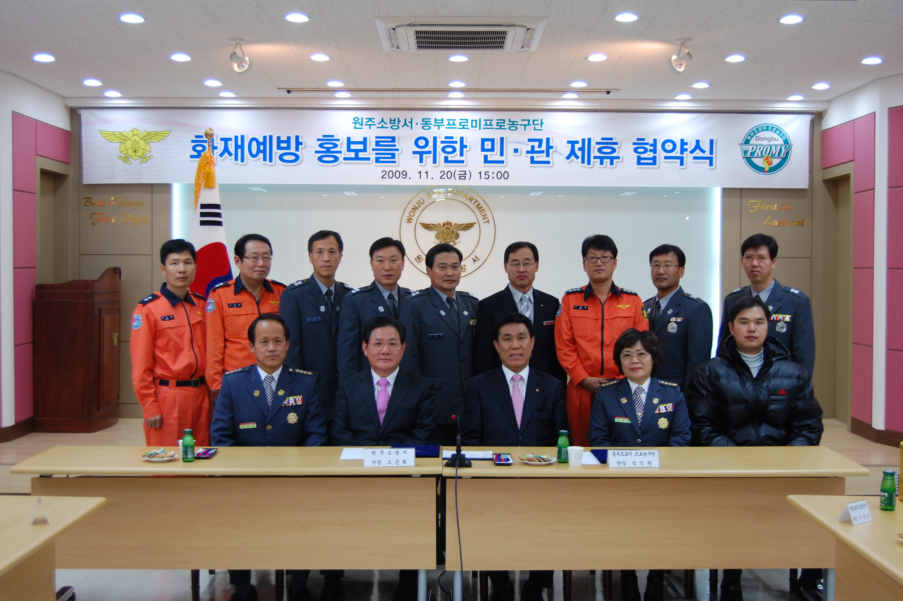 지난11/20일 15:00에 원주소방서 회의실에서 동부프로미와 함께 화재예방,홍보를 위한 민,관제휴 협약식이 있었습니다. 원주소방서 서장님(서장 조근희)이하 직원들 남,녀 의용소방대 연합대장님이 함께 참가하여 화재예방에 대한 의식을 더욱더 강화 하였고 늘 위험속에서 고생하시는 소방관님들에게 새로운 힘을 불어넣는 계기가 된것 같습니다. 앞으로 민,관이 힘을 합하여 화재예방에 대한 홍보를 펼쳐 나간다면 우리곁에 화재란 있을수 없을거라 생각하며 우리모두 불조심 합시다.