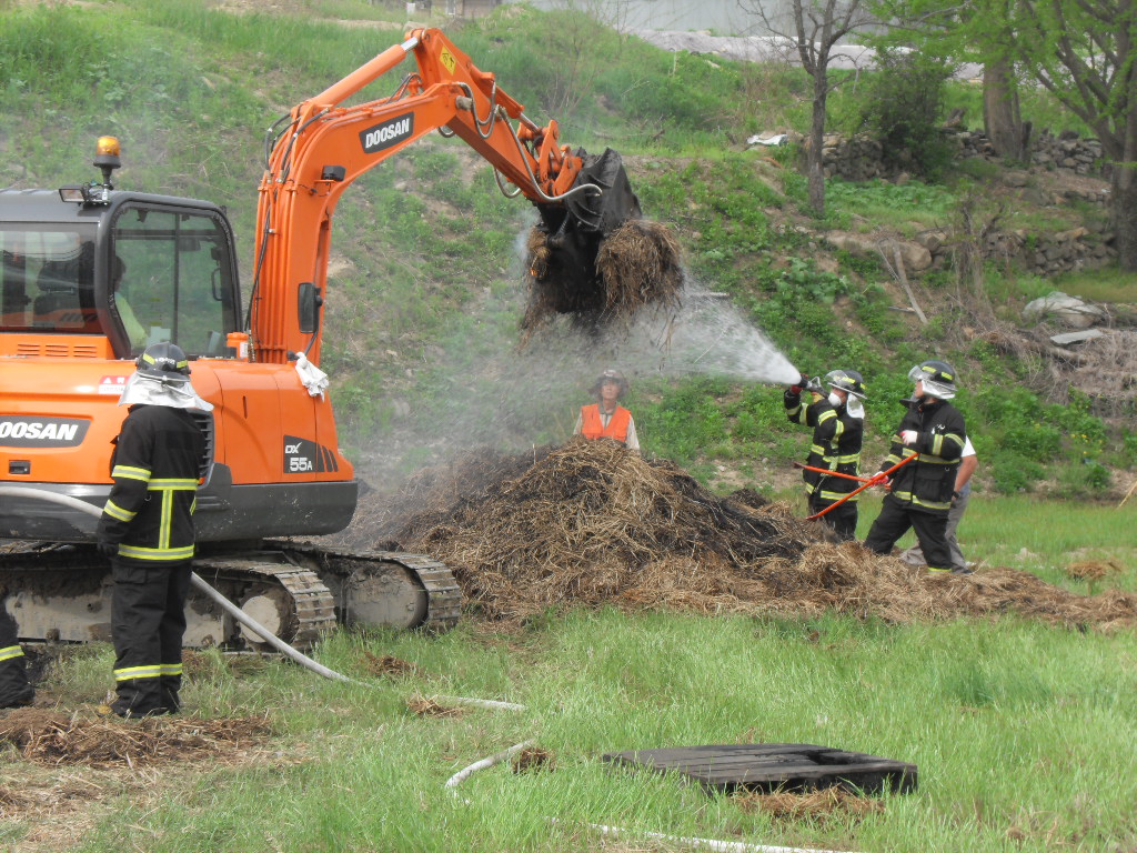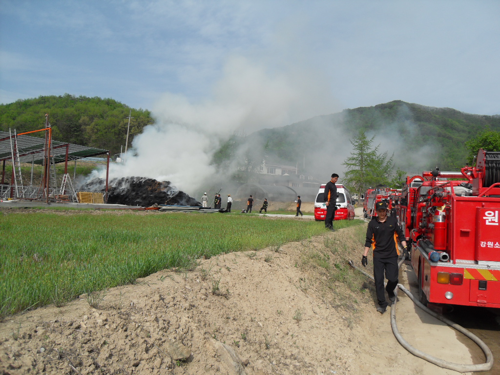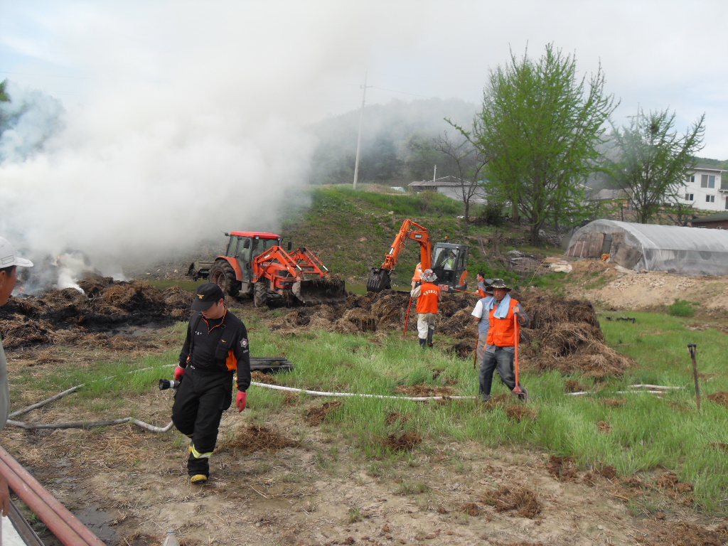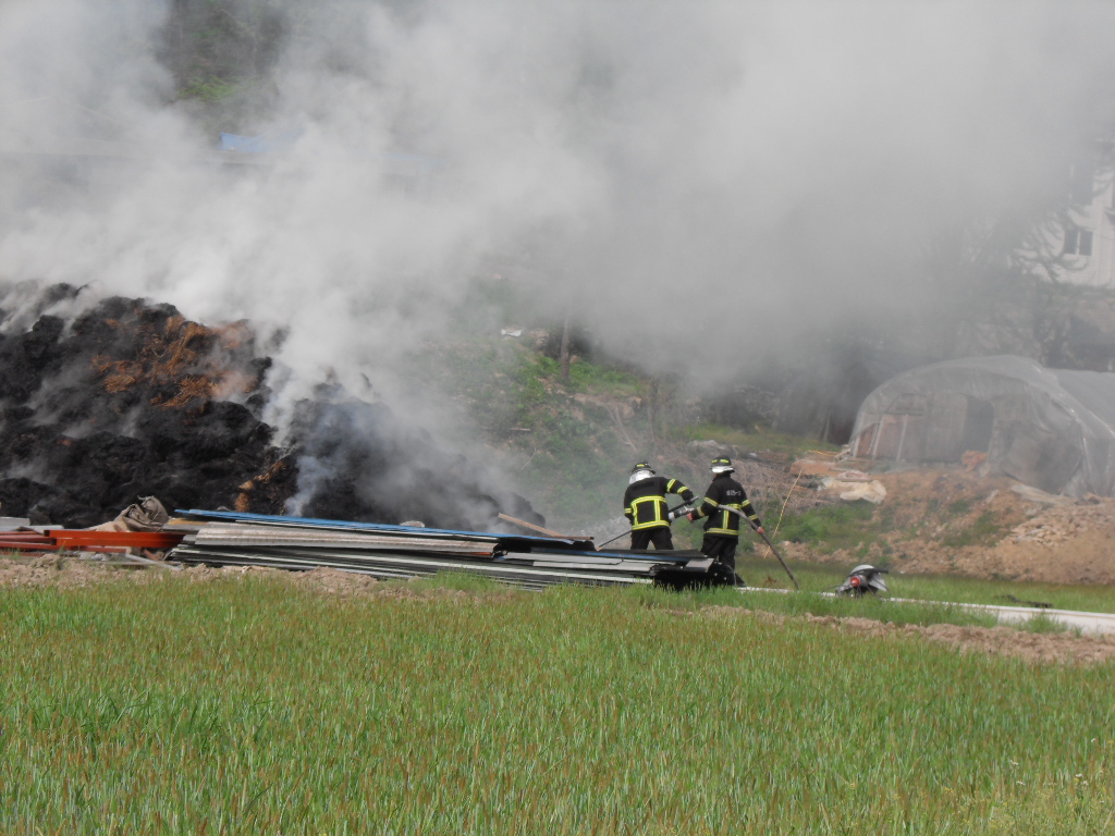 부론의용소방대(대장 김진수)는 5월9일 15시10분경 발생한 정산리 샘골 마을 축사 볏짚 화재에 15명의 대원이 출동 화재진압및 진입로 확보등 화재진압 활동을 진행하였습니다. 이날 화재는 건조한 날씨속에 축사보수 공사중에 용접불똥이 볏짚으로 옮겨붙어 일어난것으로 추정되며 인명피해는 없었으나 볏짚에 붙은 불이 특성상 소화하기가 힘들어 포크레인등 장비를 투입해서 일일이 볏짚을 헤집고 옮기면서 진화하는등 장시간 진화작업이 이뤄졌습니다. 농가에서는 사소한 작업에도 불씨가 옮겨붙을수 있는점등을 주의하여야 하겠습니다. 저녁 늦은 시간까지 작업에 참여해 주신 대원분들에게 다시 한번 감사드립니다.