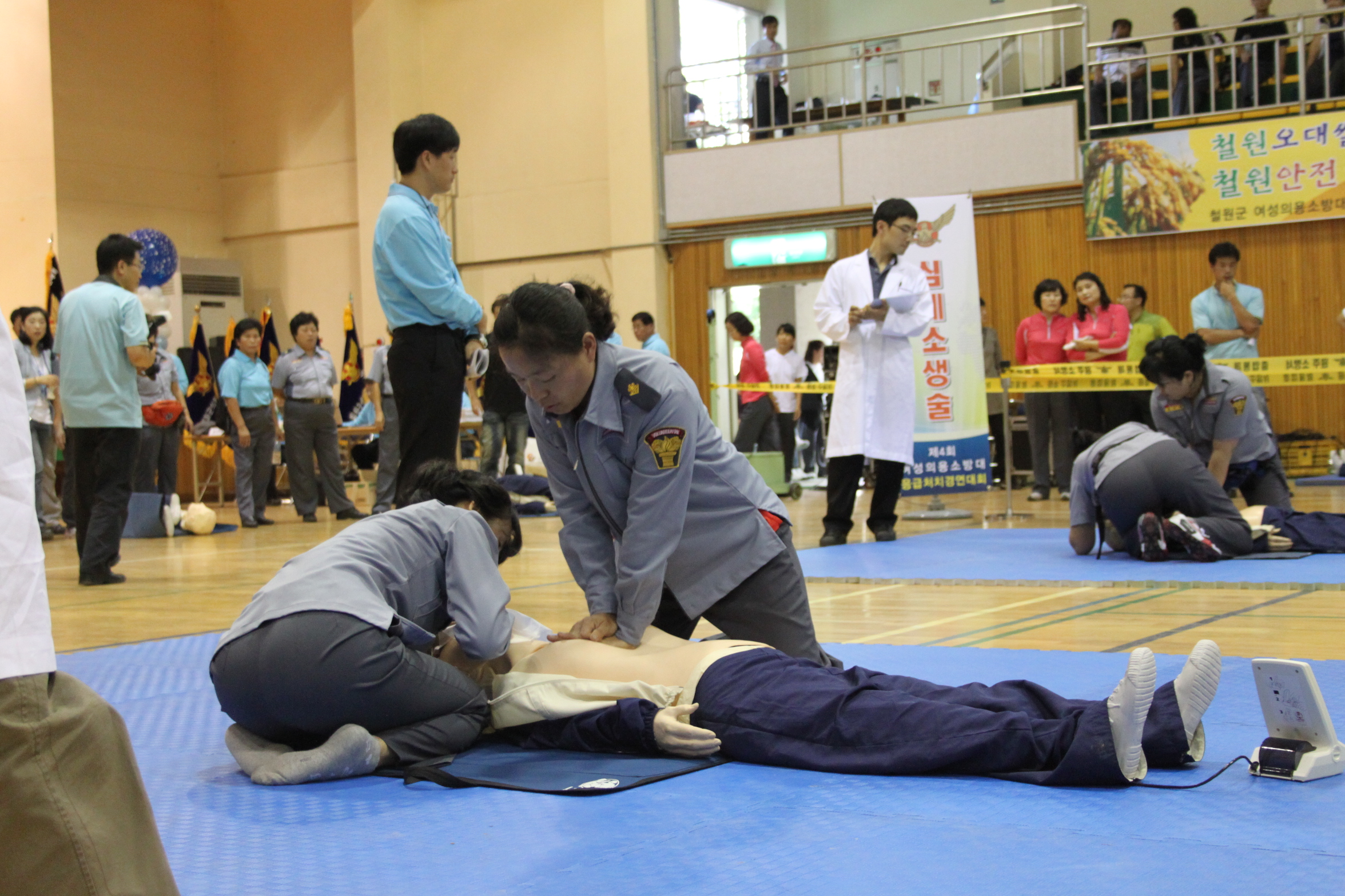 응급처치경연대회 경연종목으로 심폐소생술(소초여성대:여주화, 원재화님)과 부목고정응급처치(이은희, 박정미, 이영순님) 2종목에 참가하여 종목별 3등과 2등이라는 우수한 성적을 거두었습니다.