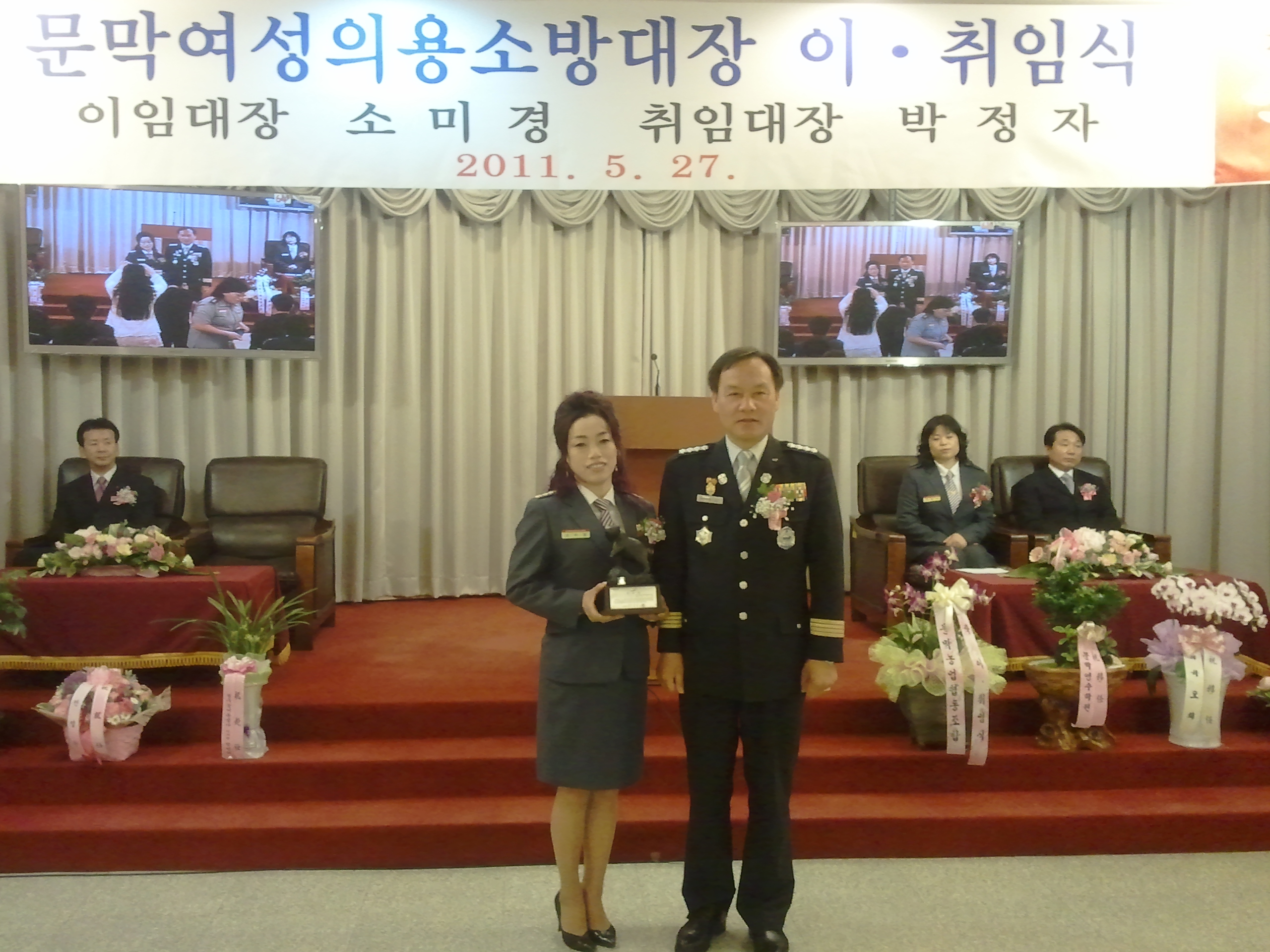 흥업여성대의용소방대(대장오오석)외 1명은 제4대 문막여성대장 이.취임식을 참여하였습니다. 소미경대장님은 발대부터 12년을 의용소방대 활동을 하였습니다.정말 고생많은셨습니다.취임대장 박정자대장님 축하드립니다. 잘부탁드립니다.