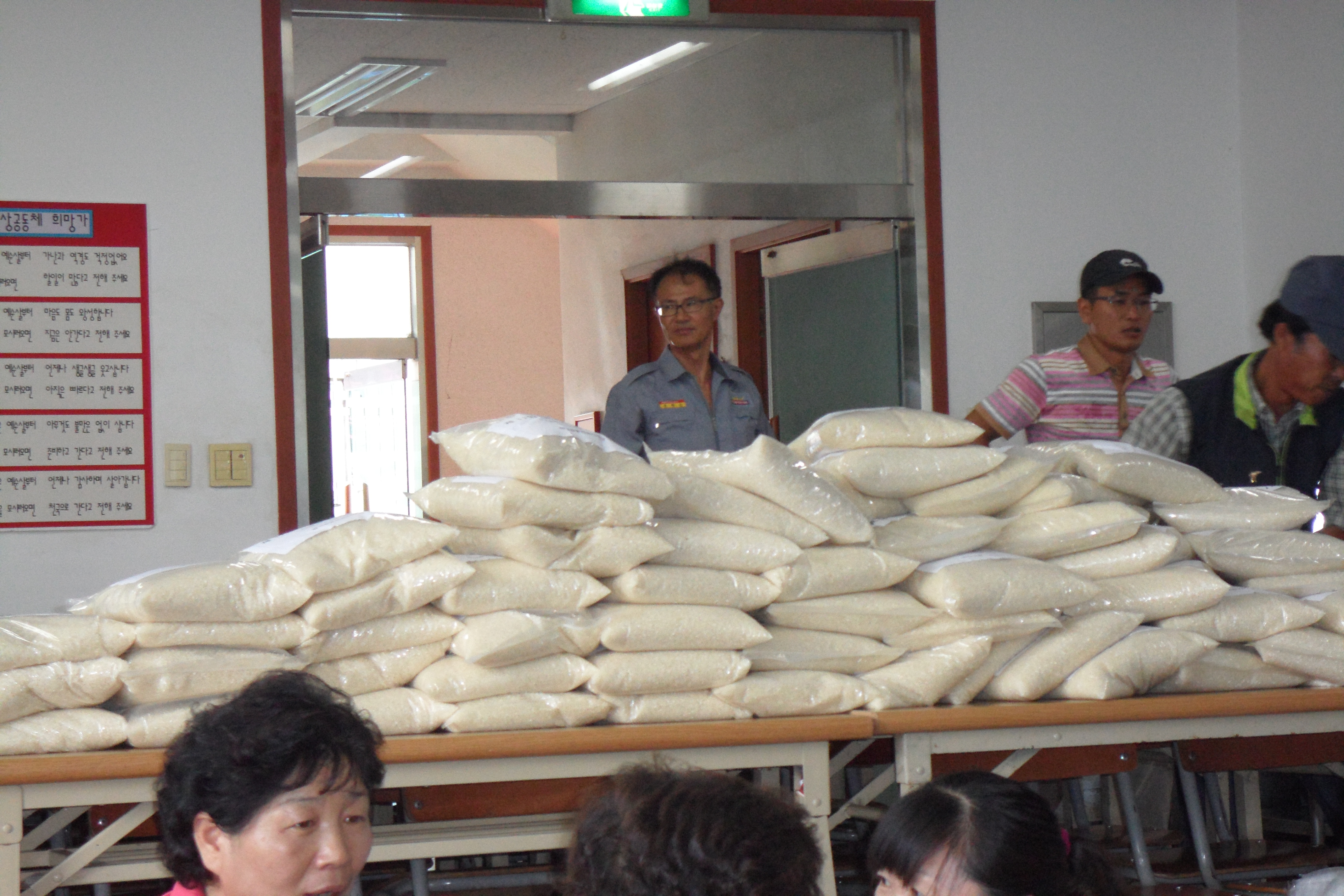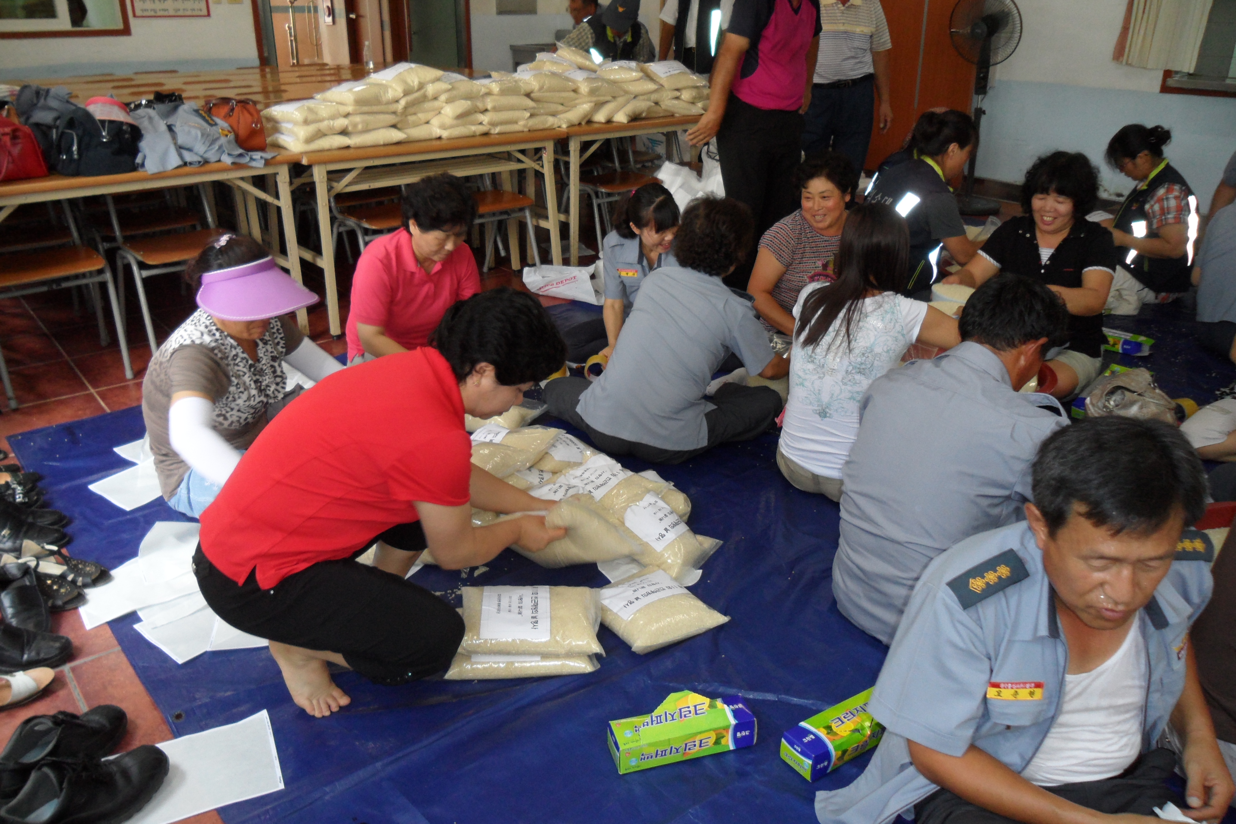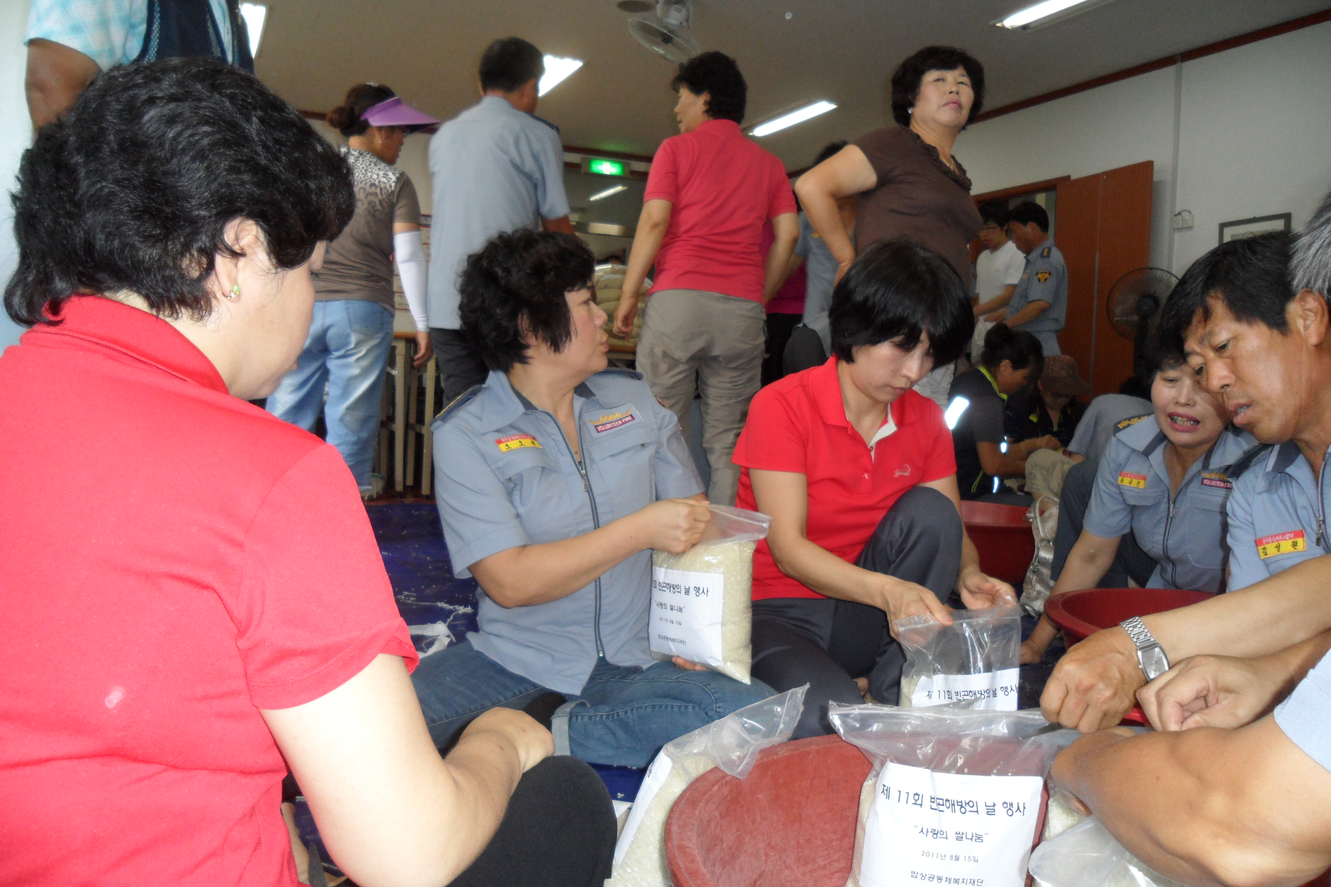 따라서 그 날 행사에 사용될 사랑의 쌀 소포장 작업을 하였는데 흥업남.여의용소방대를 비롯하여 각 대에서 3명이상씩 참여하였습니다. 일손이 많으니 산더미(?!)같던 쌀포대가 순식간에 바닥이 났습니다. 인해전술(???!!!)은 아주 많이 무섭습니다......ㅎㅎ