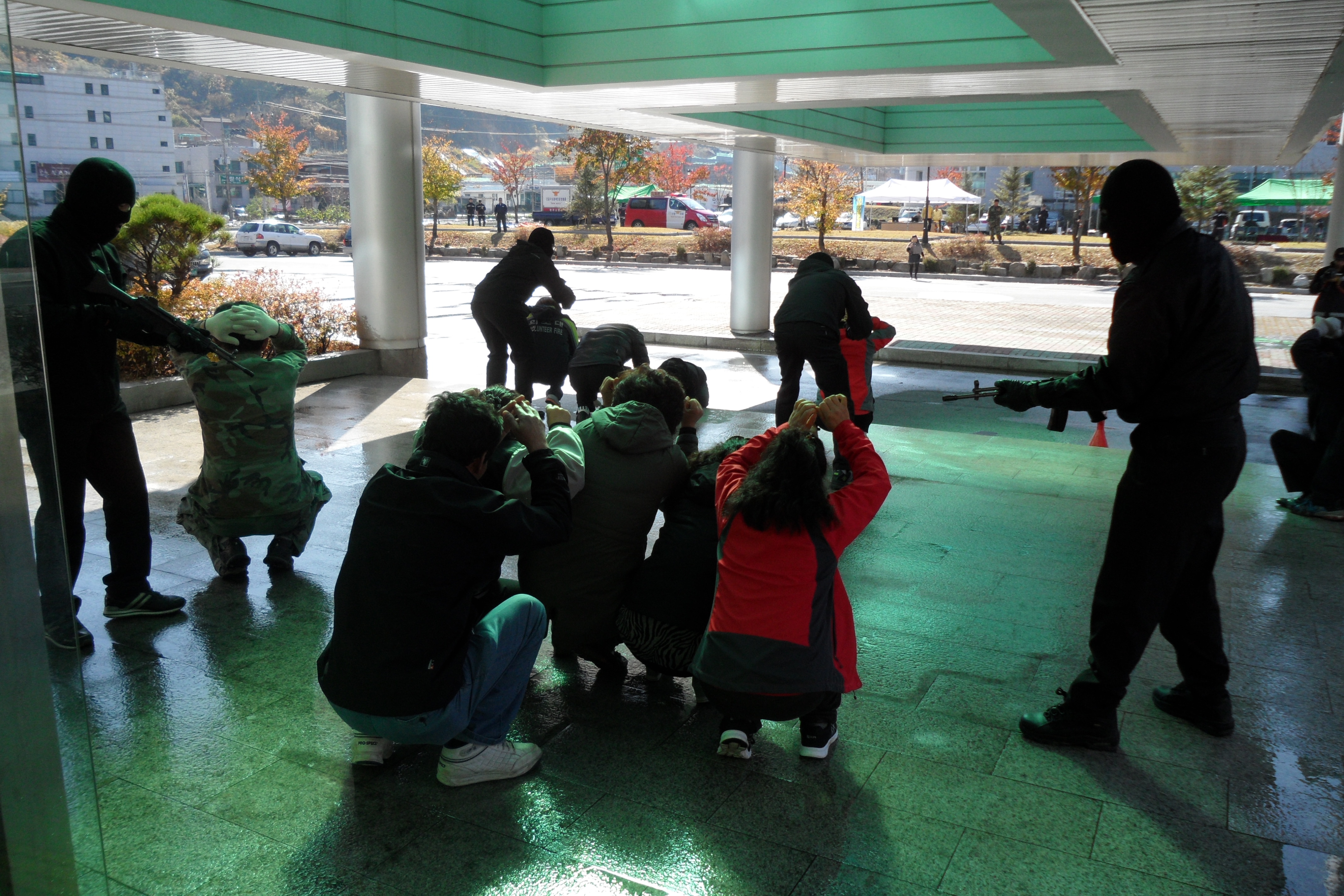 상황 발생 전파 및 군ㆍ경 특공대 투입하여 테러진압, 폭발물 제거 및 처리, 인명구조, 사상자 응급처치 및 건물 화재진압, 방역 등 긴급복구 및 수습활동 등에 관한 중점훈련이 실시되었고, 흥업남녀의용소방대는 테러범 진입시 탈출자, 인질, 사망자, 환자 역할 및 추운날씨에 훈련하느라 고생하신 모든 분들게 따뜻한 차를 대접해드렸답니다.