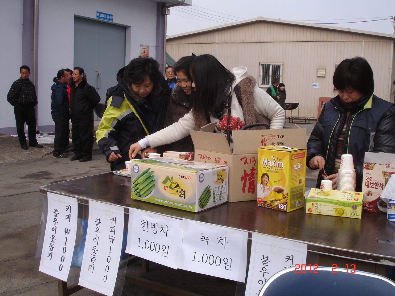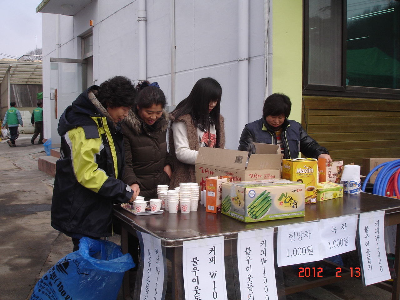 2월13일 호저 면사무소 마당에서 호저면민 ?놀이가 부인회와 새마을지도자들의 주최하에 한마당 큰잔치가 있었읍니다 그날 호저남성대는 차량주차를 봉사하였고요 우리 여성대는 추운날씨에 불우이웃기금 마련 커피 ?매를 하였읍니다 인원은6명