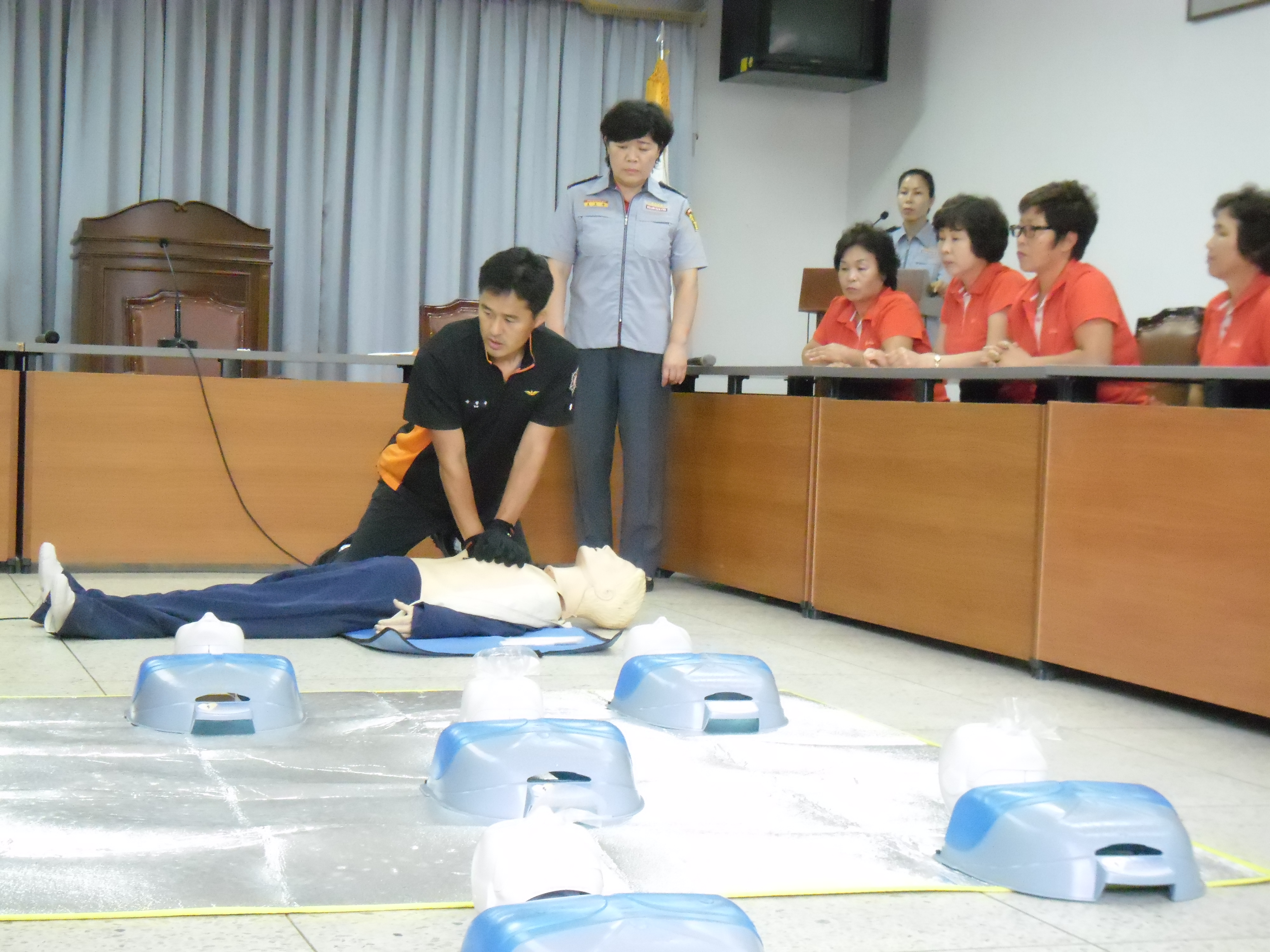 현장대응과 구조구급대 유일수 구급대장님을 교관으로 모시고 심정지환자에게 실시하는 응급처치법인 CPR교육 (흉부압박 및 자동 제세동기 사용법) 과 이물질에 의한 기도폐쇄 환자에게 실시하는 복부밀어내기법의 처치방법 등의 실습과 더불어 이후의 봉사활동 계획과 9월에 평창에서 개최될 응급처치기술경연대회에 관한 토의도 빠트리지 않았답니다.