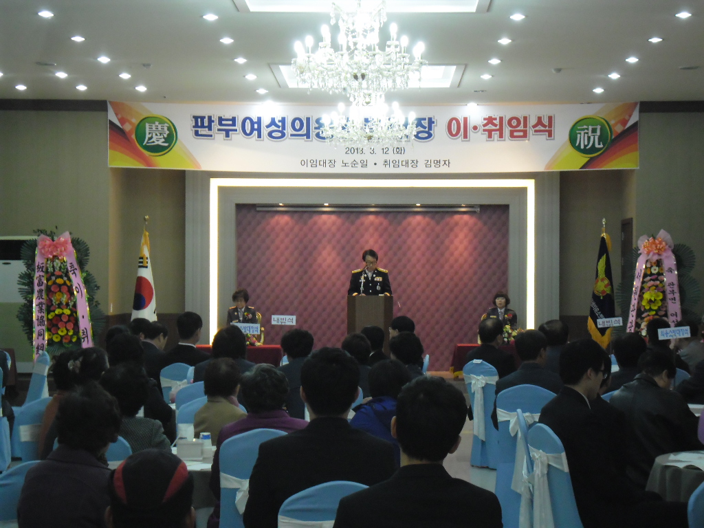 2013,3,12일 판부여성대는 2대 대장 노순일 대장님이 이임하시고 3대 대장으로 김명자대장님이 취임 하셨습니다. 지난 임기동안 고생하신 노순일 대장님께 감사의 마음을 전합니다 그리고 김명자대장님 다시한번 축하드립니다.