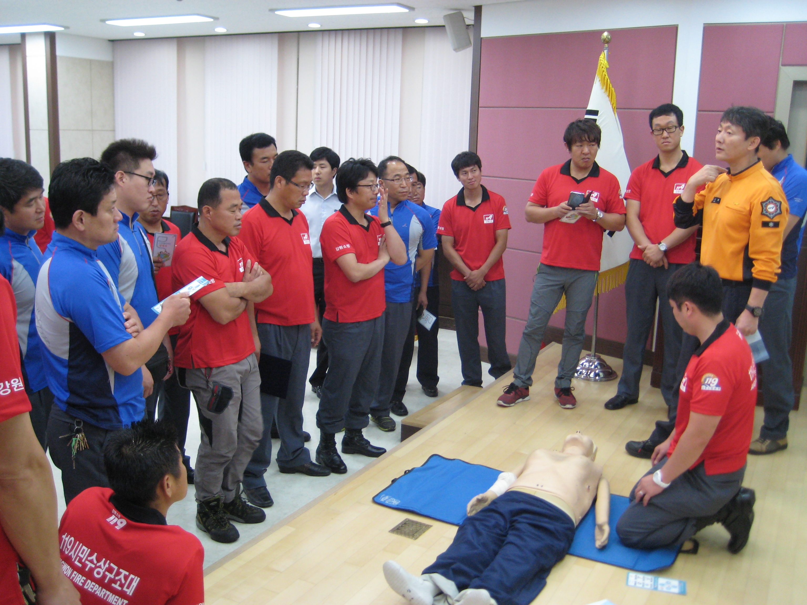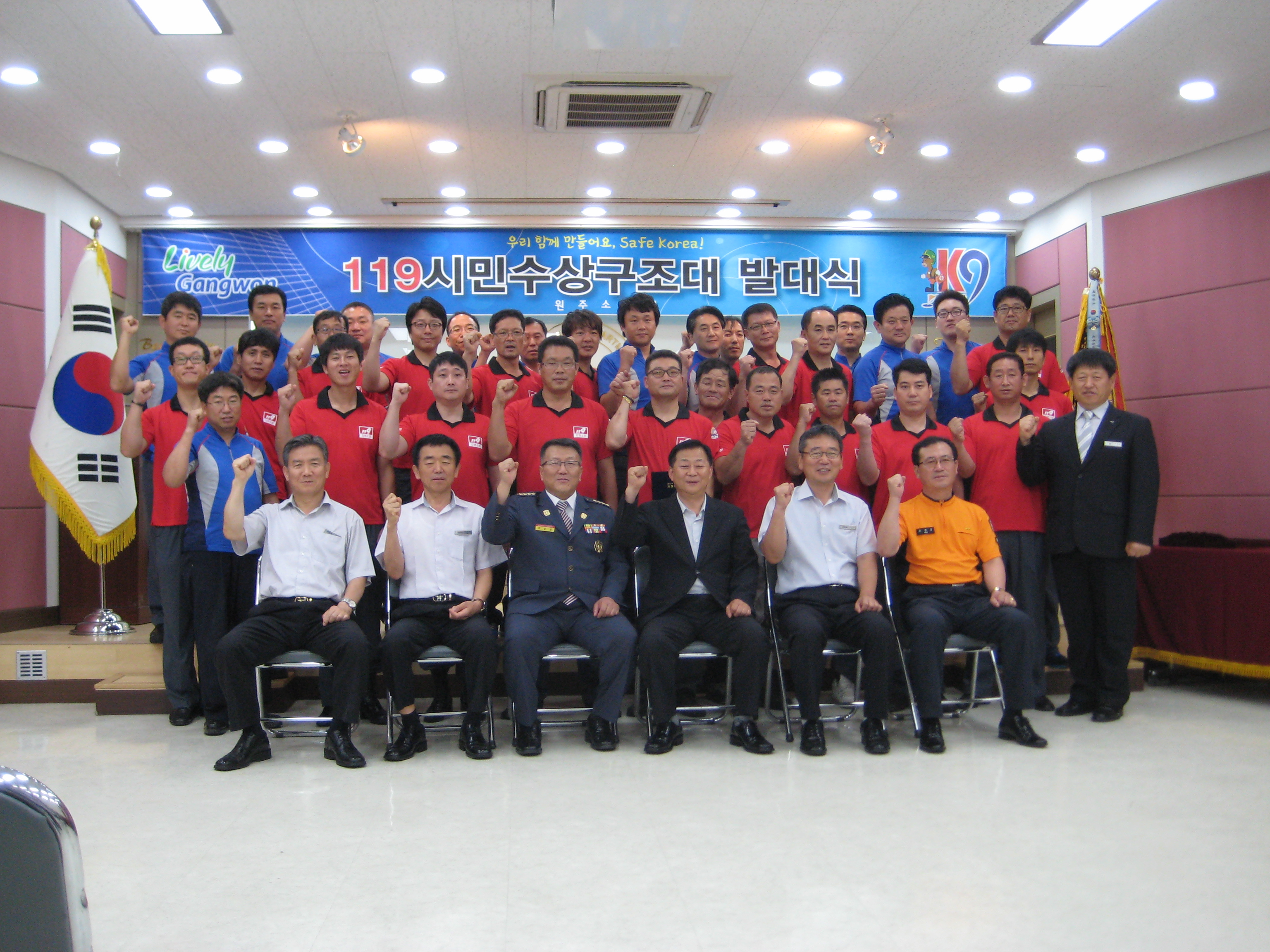원주의용소방대(대장 조성일)는 7월18일 원주소방서에서 119시민수상구조대 발대식을 50명이 참가하여 실시했습니다. 조성일대장님의 정기교육 과 서장님이 직접 임명장을 20명 대원에게 전달하였습니다. 이후 20일부터 근무를 할 칠봉유원지를 대원들이 참가 주변정리 및 안전사고 지역을 순찰하였습니다