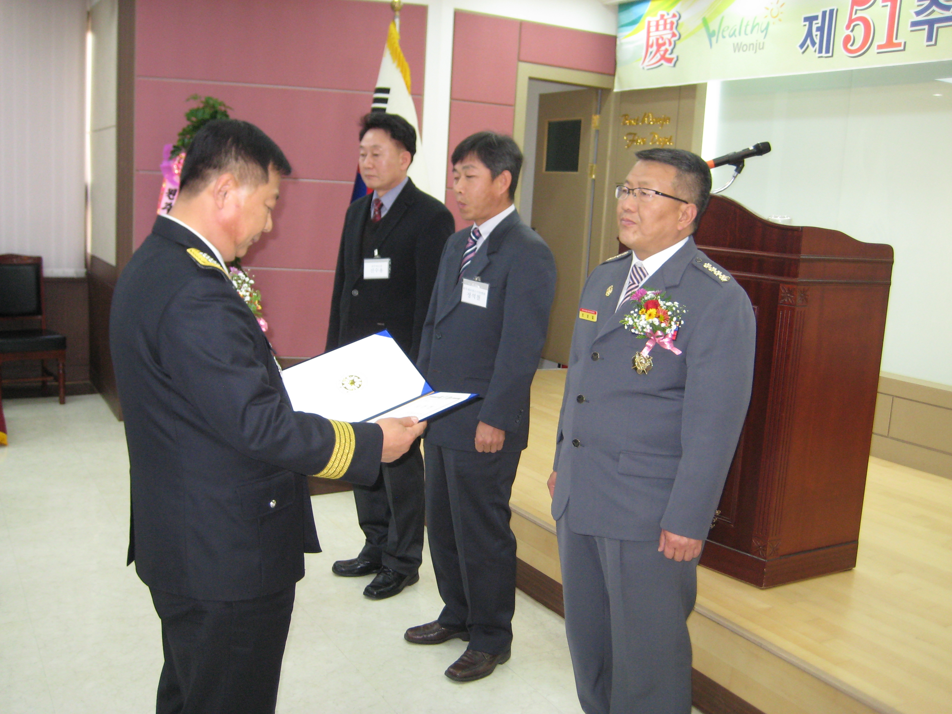 원주의용소방대(대장 조성일)는 11월13일 제51주년 소방의날을 맞이하여 원주의소대가 소방방제청장,단체표창을 수상하였습니다. 김영춘반장님과 박광진대원이 시장님,서장님상을 받았습니다