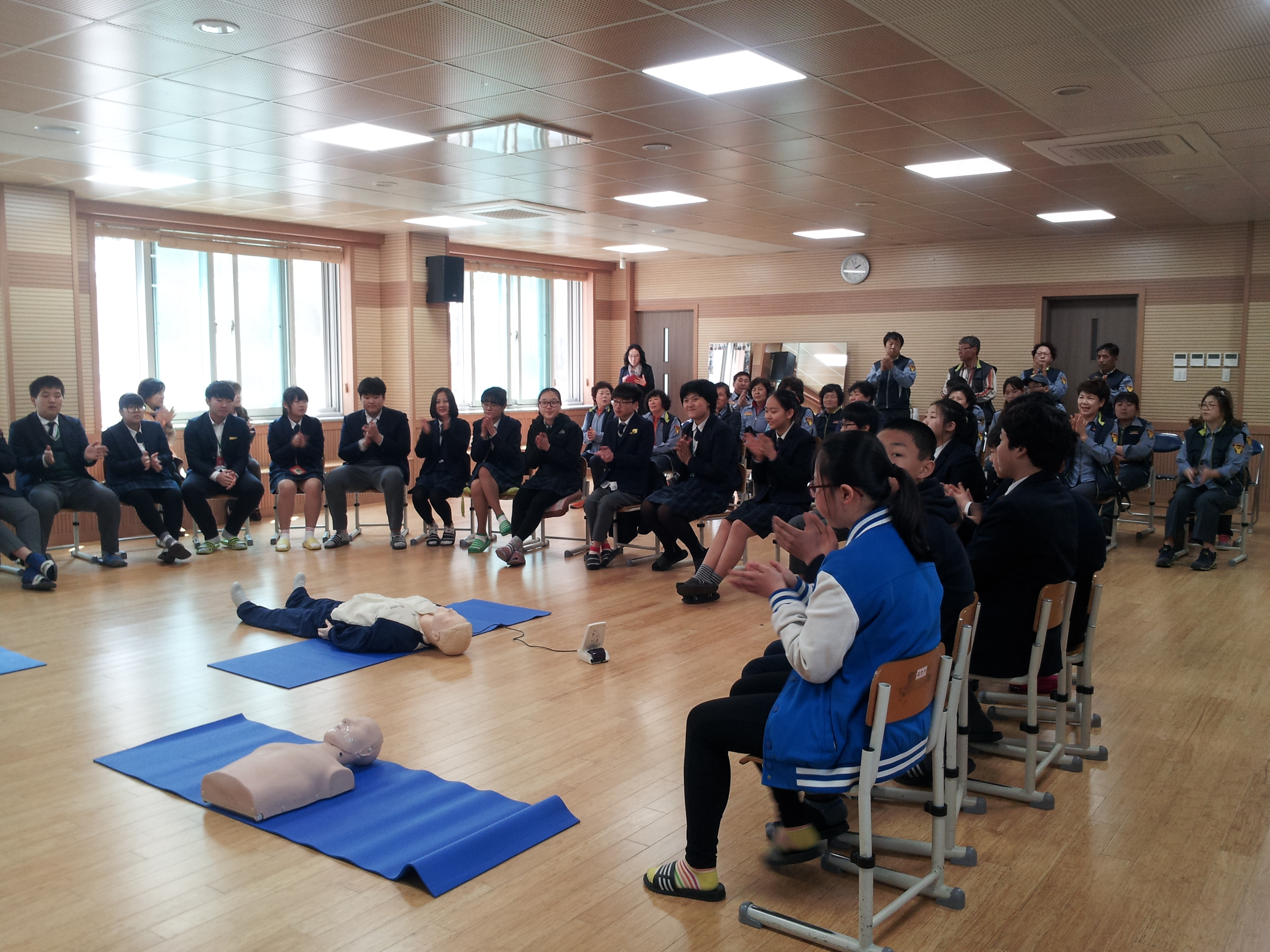 4월10일 교육 및 맴페인으로귀래중학교 은향관에서 교직원 및 학생들에게 심폐소생술 시범 및 안전교육을 실시하였습니다