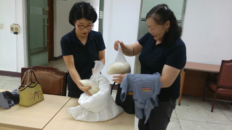 흥업여성 의용소방대는 정기교육시 쌀을 모아서