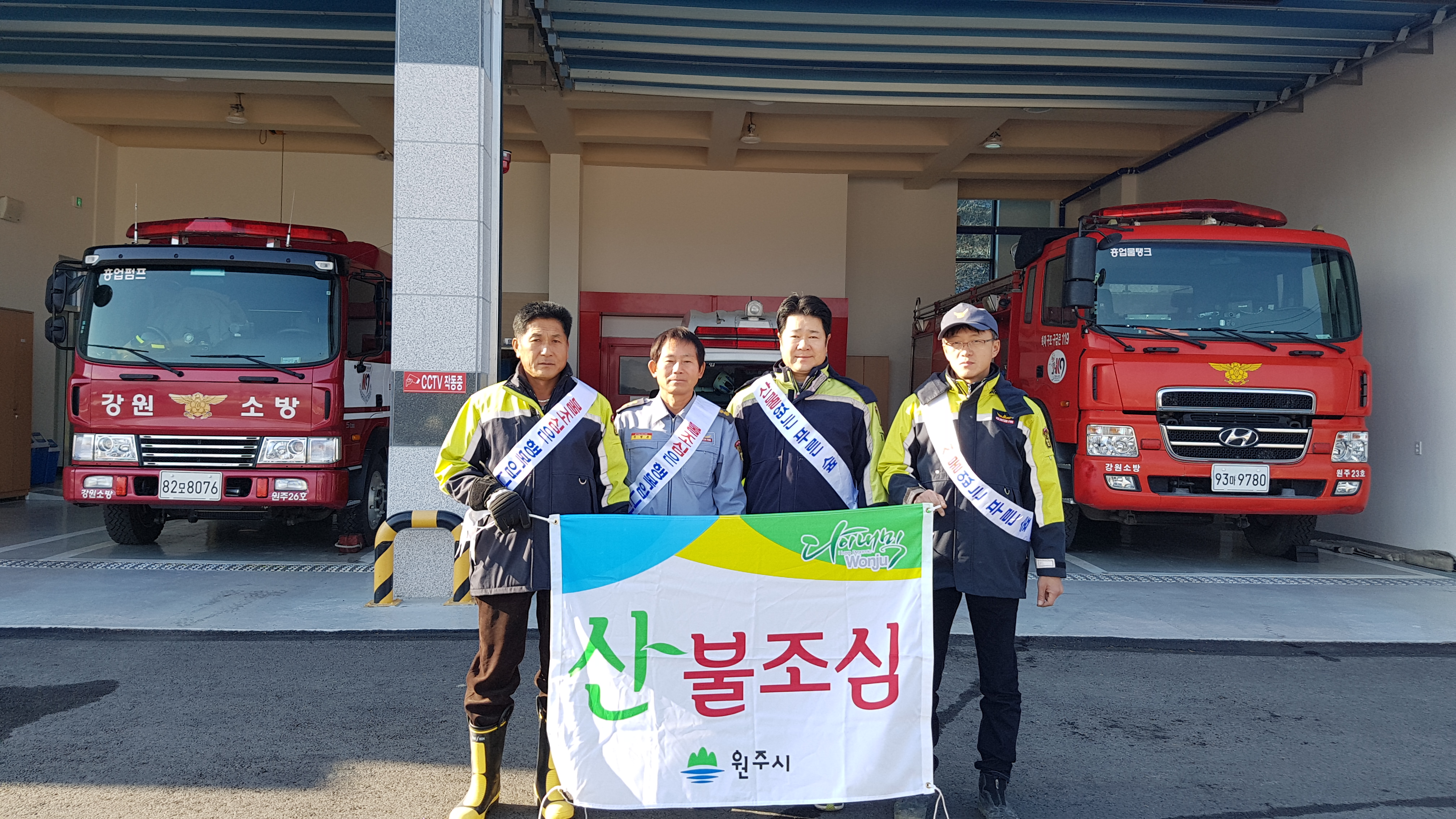 장비 : 산불예방 홍보 어깨띠, 갈퀴, 등짐펌프.산불예방 현수막