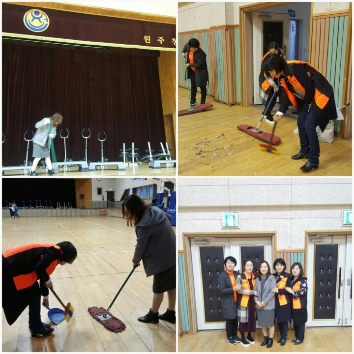 내용: 체육관 실내 바닥청소 및 입구먼지제거 쓰레기분리수거