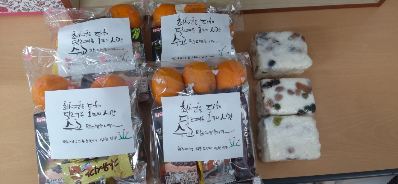 맛깔나는 다과와 더불어 특히, 직접써주신 멋진 글귀가 더욱 의미가 있는 듯 합니다.