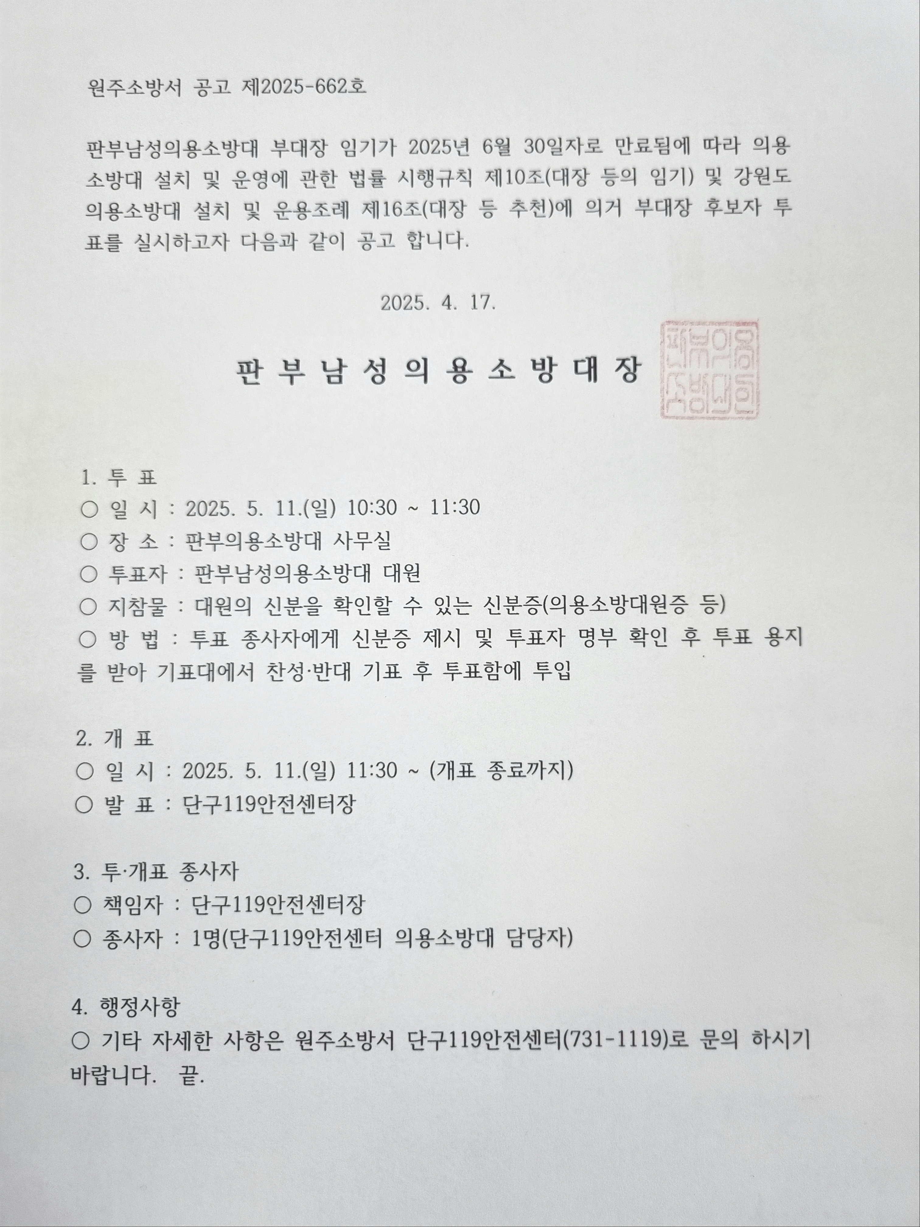 판부남성의용소방대 부대장 임기가 2025년 6월 30일자로 만료됨에 따라 의용소방대 설치 및 운영에 관한 법률 시행규칙 제10조(대장 등의 임기) 및 강원도의용소방대 설치 및 운용조례 제16조(대장 등 추천)에 의거 부대장 후보자 투표를 실시하고자 다음과 같이 공고 합니다.