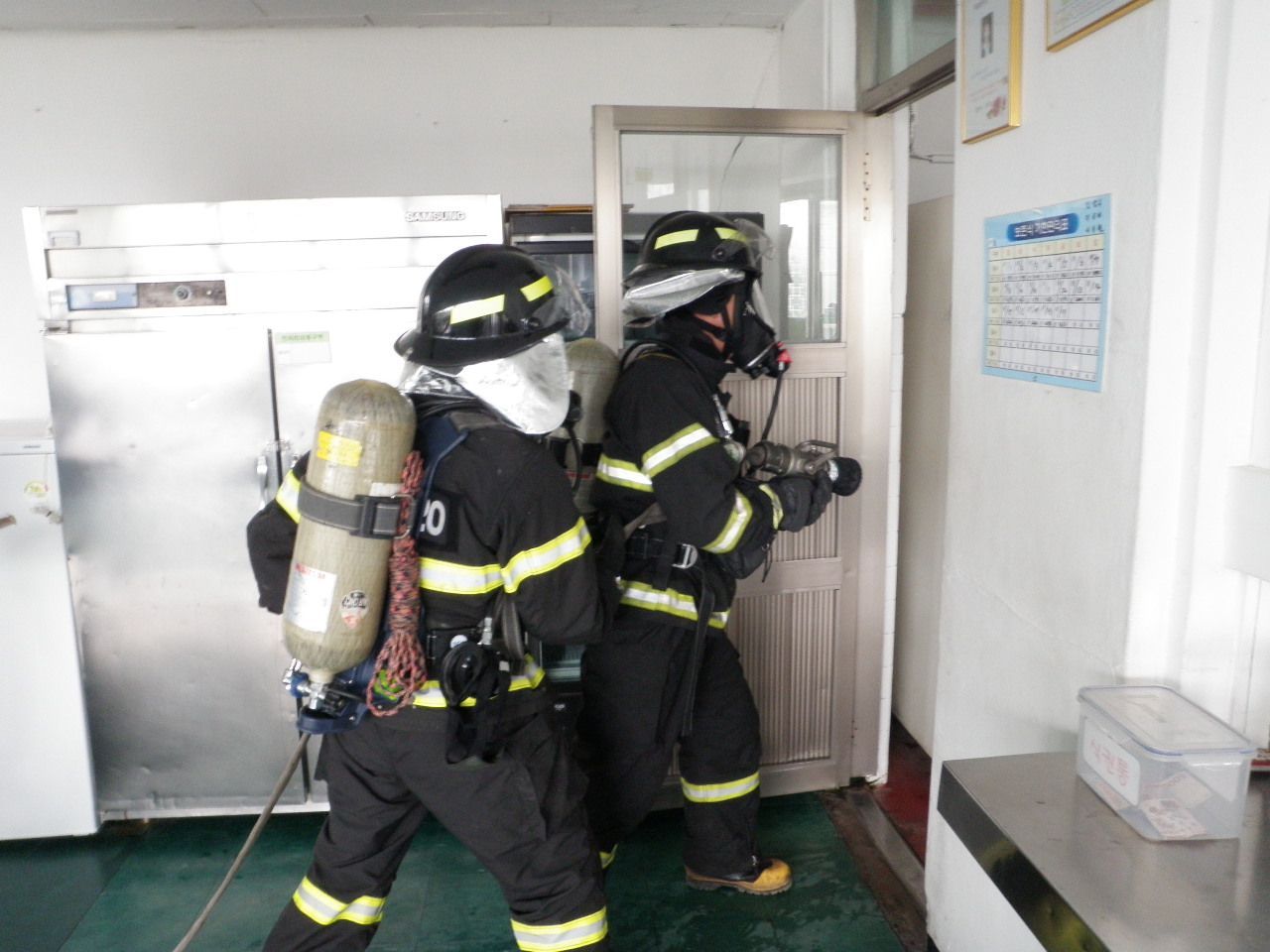 화재위험도가 있는 1층 식당 내에 화재가 발생한 상황 및 이에따른 환자1명이 발생한 상황을 설정하여 실상황에서 신속정확하게 대처하기 위하여 실전과 같이 훈련에 임하였습니다.