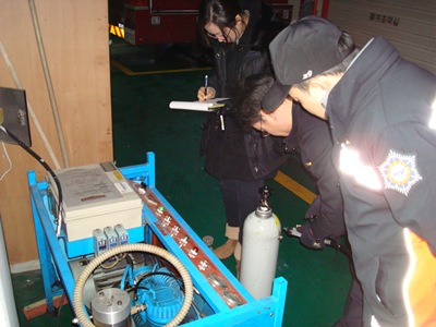 소방서에서는 현장활동시 맑은공기를 마시기 위하여 정기적으로 충전기 공기 성능분석을 실시합니다.