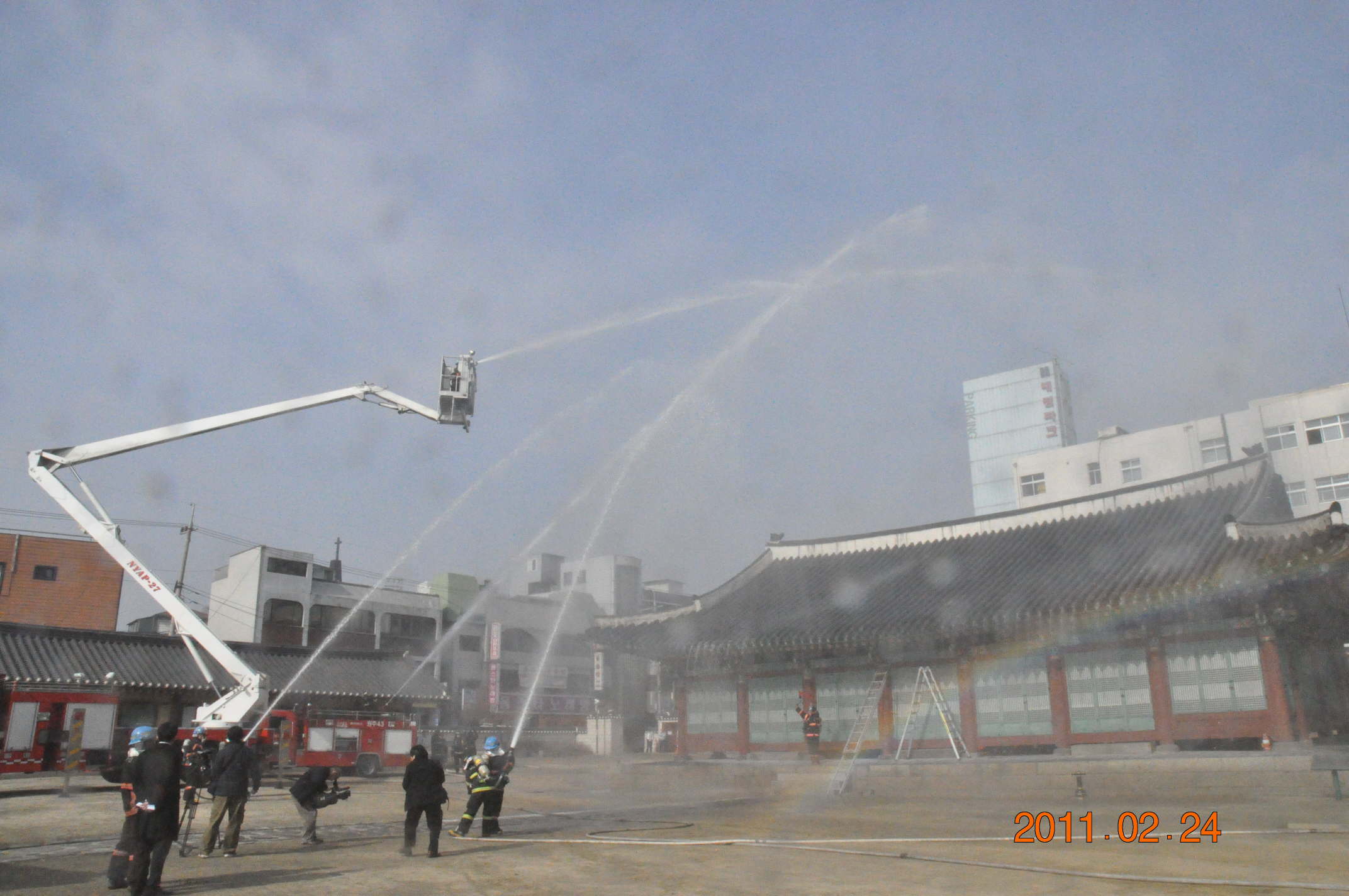 문화재 보호를 위한 실질적인 화재진압훈련을 하였습니다.