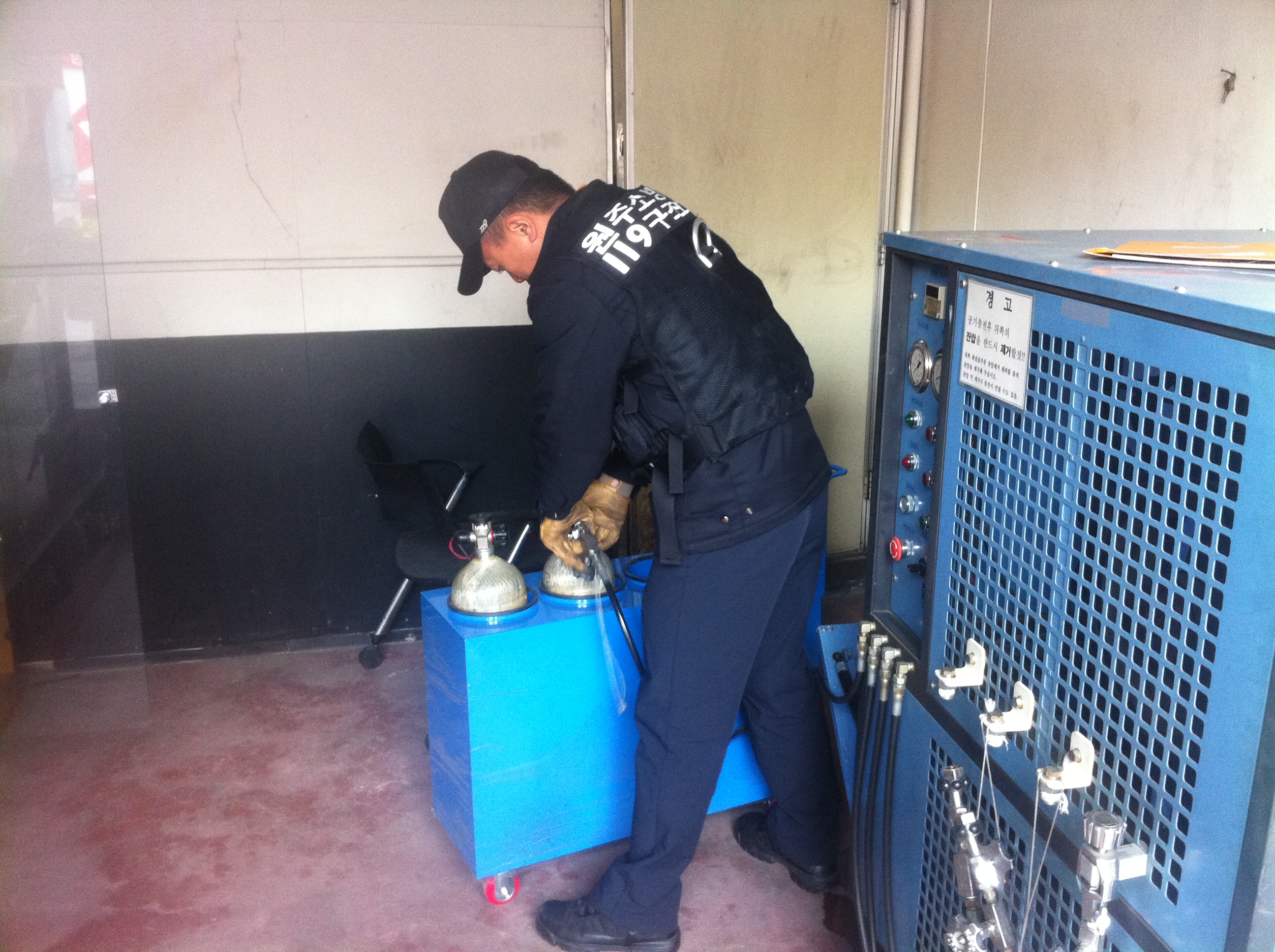 원주소방서(서장 김시균) 119구조대는 전일 화재출동에서 사용한 공기호흡기 용기에 신선한 공기를 재충전하였습니다.
