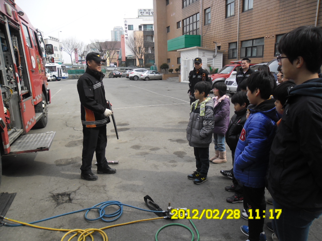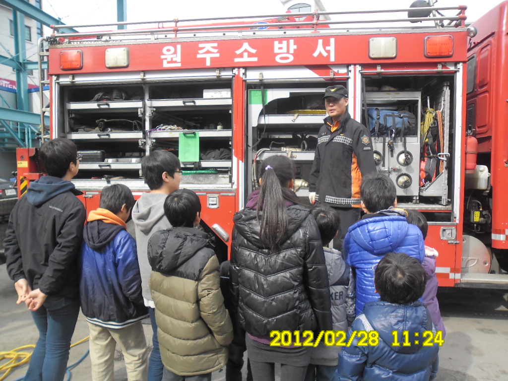 원주소방서(서장 김시균) 119구조대는 2012.02.28. 원주의 아동복지센터 어린이들이 방문하여 구조공작차 와 구조장비 소개교육을 하였습니다. 추운날씨에도 어린이들의 초롱초롱한 눈과 귀기울여 듣는것이 정말 호기심에 가득찬 모습이였습니다.