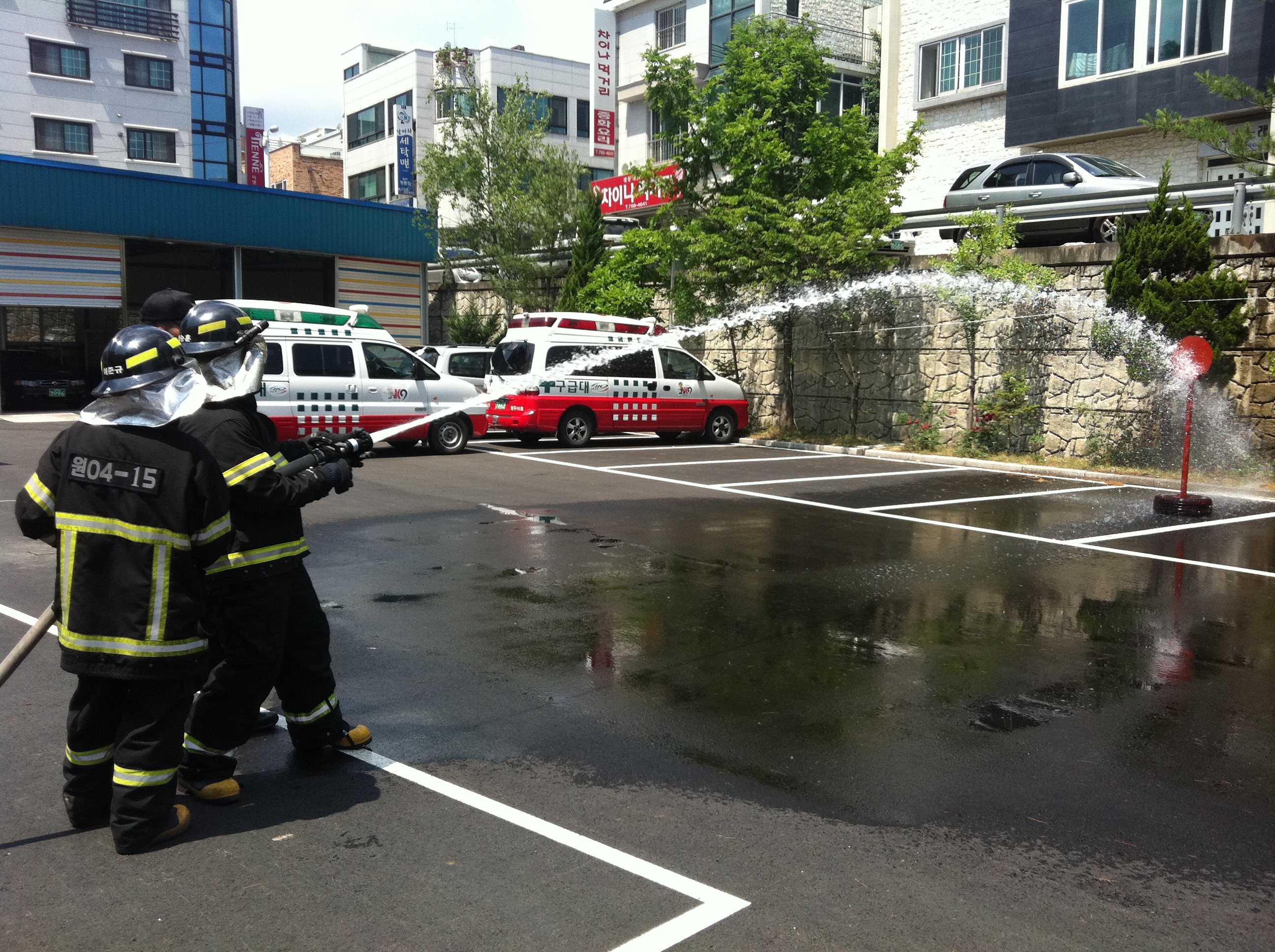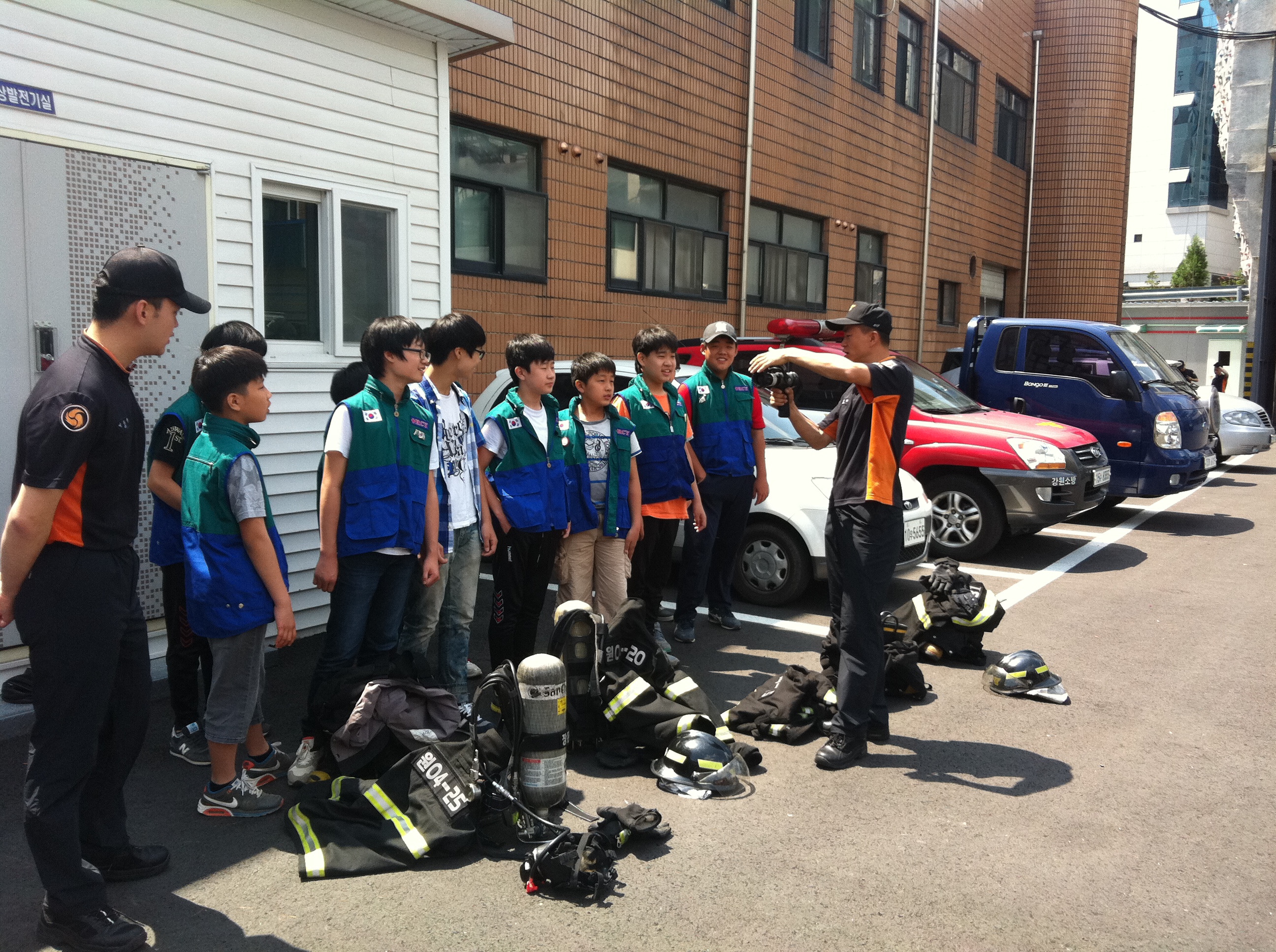 학생들이 직접 방화복도 입어보고, 방수도 해보며 유익한 시간을 가졌습니다.
