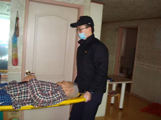 원주소방서 서장(김시균) 학성119안전센터에 근무중인 의무소방대원이 추운날씨에도 구급현장활동에 열심히 임하고 있습니다.