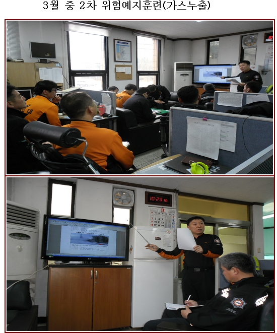 현장대응과에서는 가스누출사고 현장활동에 있어 안전대책 ,위험상항 등 종합적인 대응방안을 위한 위험예지훈련을 실시했습니다. 오늘 위험예지훈련은 유해가스누츨사고를 보면서 잠재적인 위험요소을 파악하고 어떻게 하면 대원 안전을 확보할 수 있을지 라운드별 각자 의견제시로 현장에서의 행동목표를 정했습니다.
