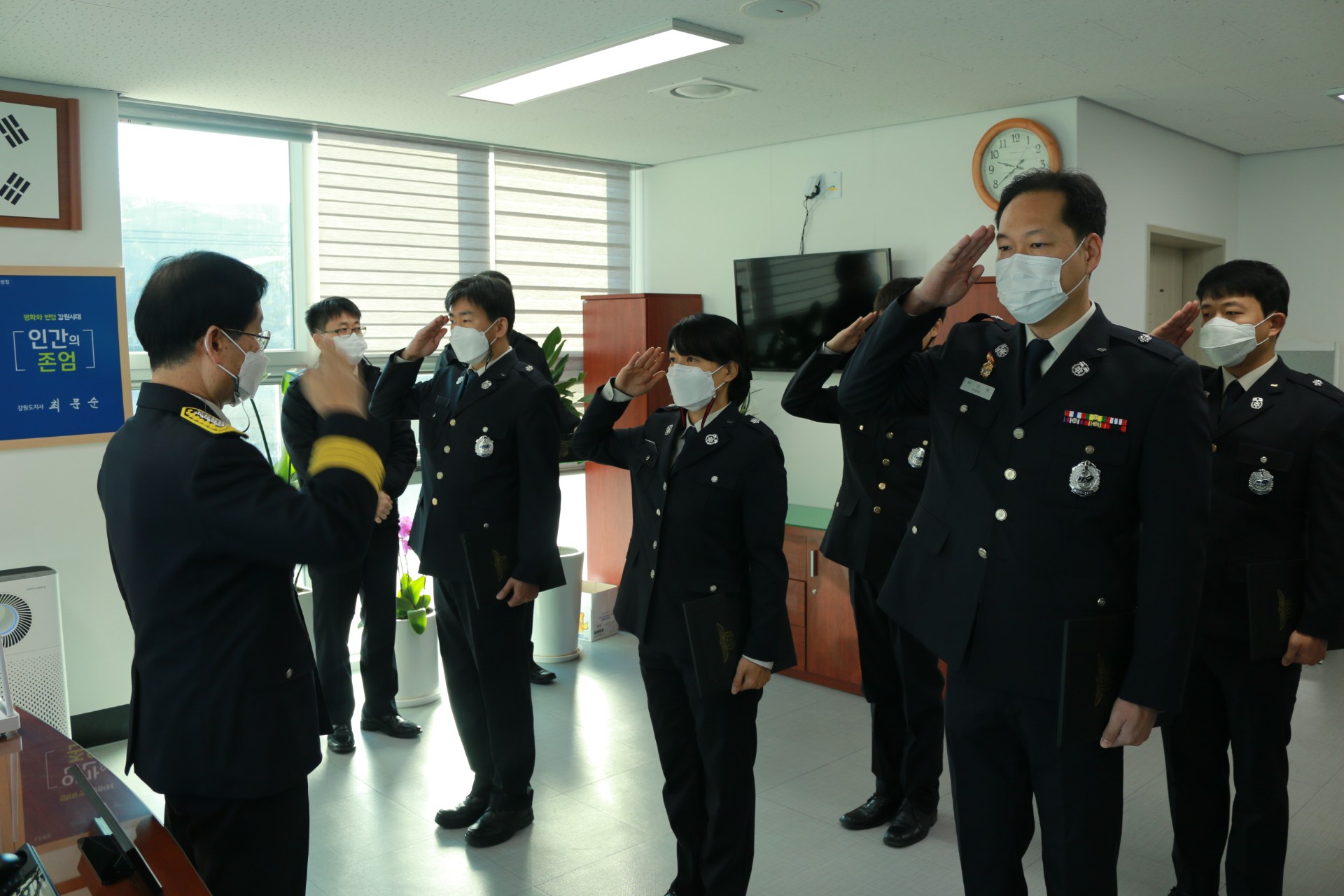 원주소방서는 12월 21일 소방위 승진대상자 5명에 대한 임용장 수여식을 개최했습니다.