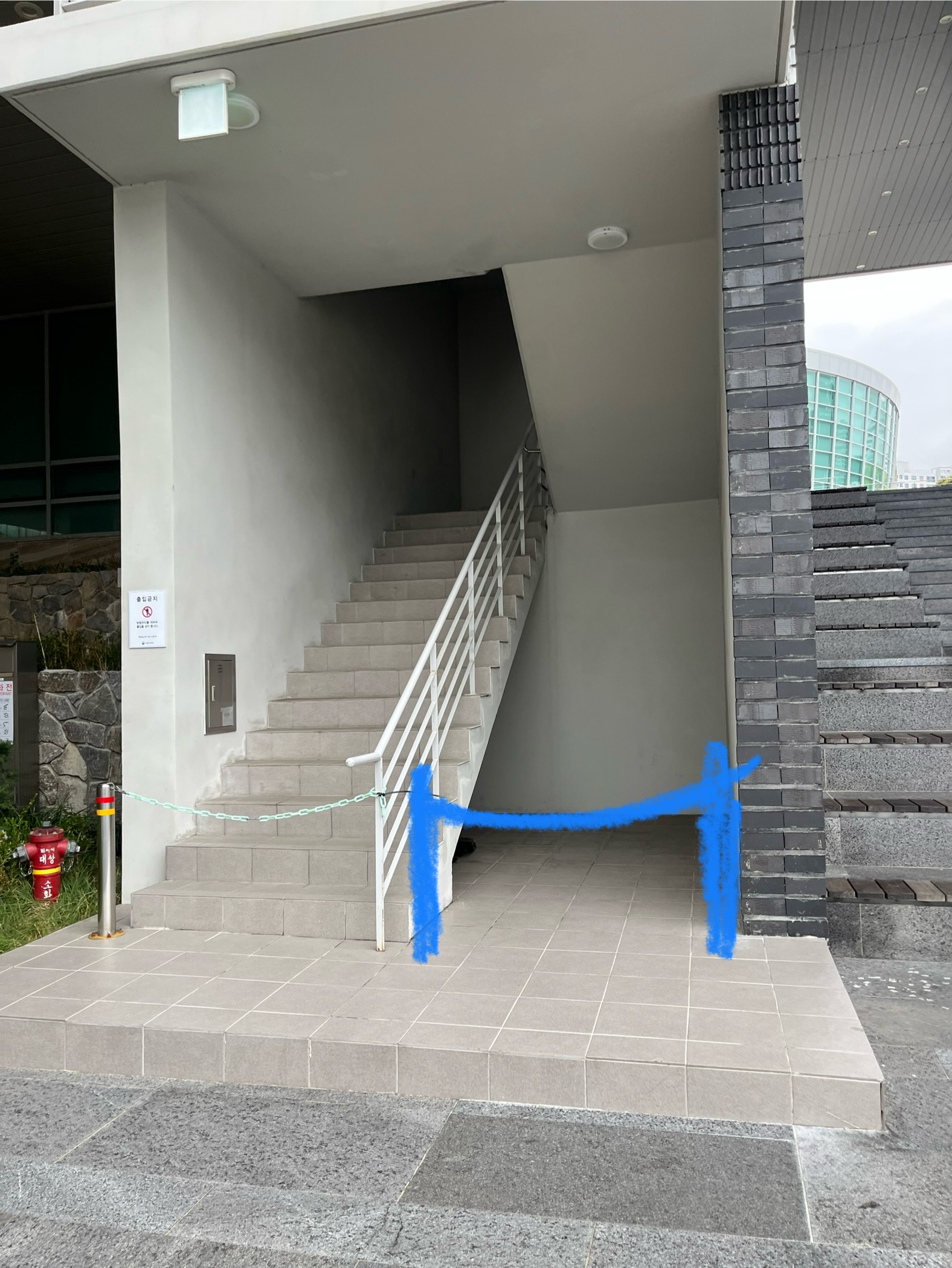 비치 공간은 야외 공간이며, 계단의 제일 아래층이자 통행이 불가(벽으로 둘러 쌓여있음)한 곳입니다.