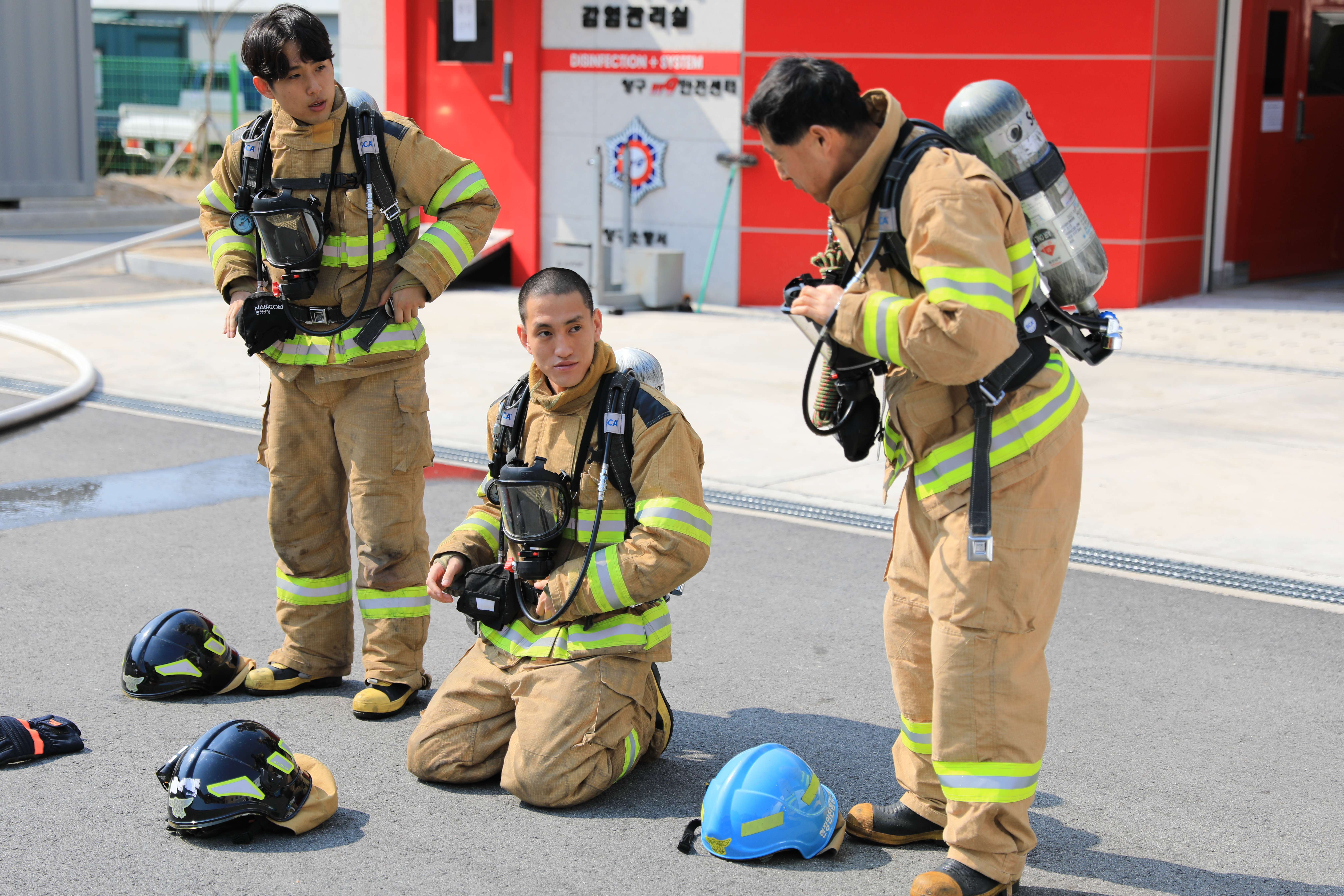 신임소방공무원들이 현장안전점검관의 감독 아래 방수훈련을 실시하고 있다.