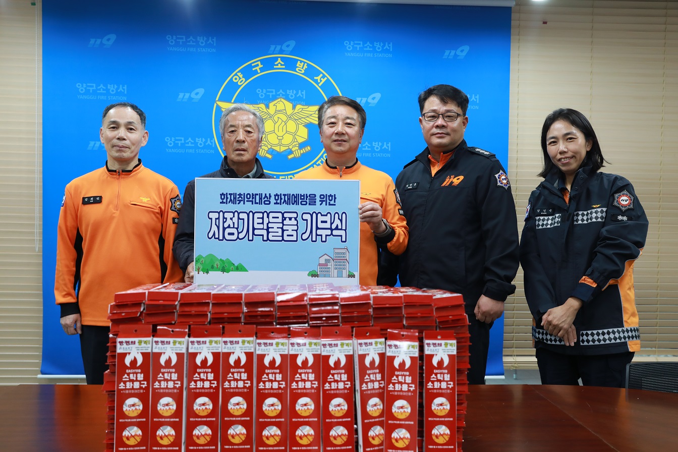 이번 기부식은 양구군 시민안전관리협의회 이덕래 부회장이 양구군의 겨울철 화재 예방을 위해 약 100만원 상당의 ‘주방 화재용 스틱형 소화용구’ 200여 개를 기부함에 따라 개최됐다.