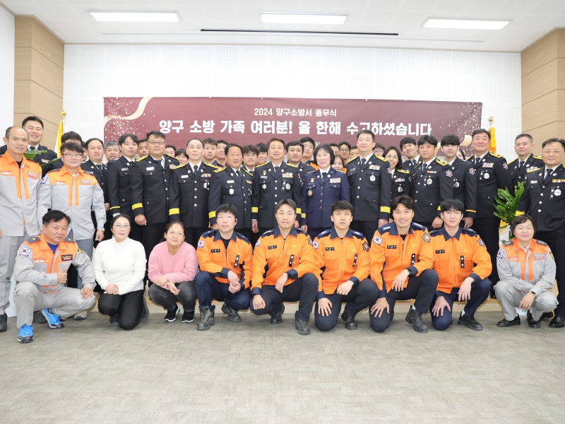 행사는 ▲서장 송년사 및 새해 인사 ▲2024년 양구소방서 소방활동 영상 시청 ▲소방행정 유공 소방공무원 및 민간인에 대한 도지사ㆍ서장 표창 ▲기념사진 촬영 등으로 진행됐다.