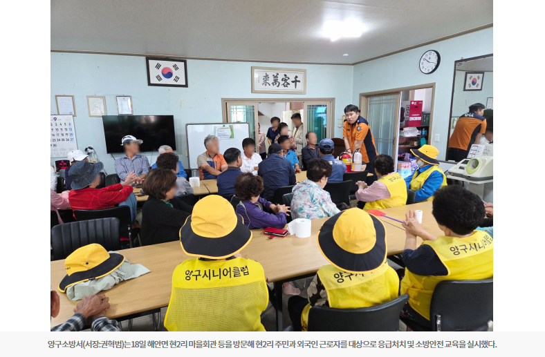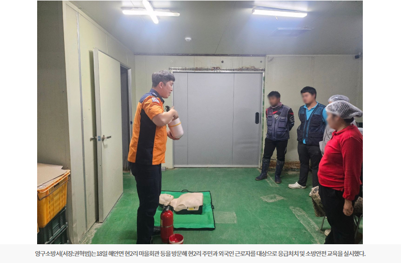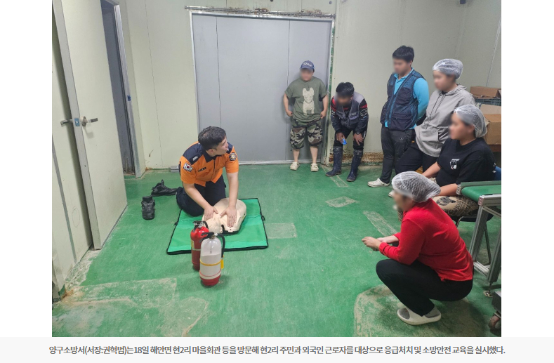 【양구】양구소방서는18일 해안면 현2리 마을회관 등을 방문해 현2리 주민과 외국인 근로자를 대상으로 응급처치 및 소방안전 교육을 실시했다.