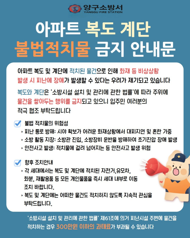 【양구】양구소방서는 공동주택 내 피난·방화시설의 폐쇄나 훼손, 계단·복도 등 피난통로에 물건을 쌓아두는 행위를 삼가해 달라고 당부했다.