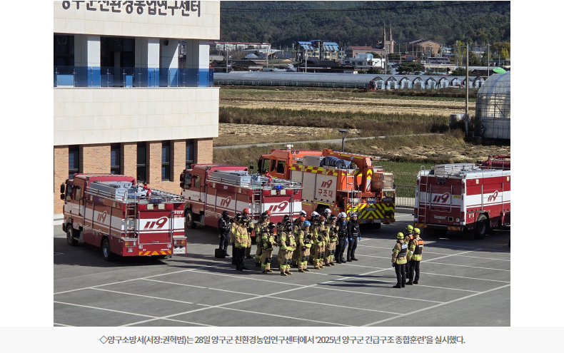 【양구】양구소방서는 28일 양구군 친환경농업연구센터에서 ‘2025년 양구군 긴급구조 종합훈련’을 실시했다.