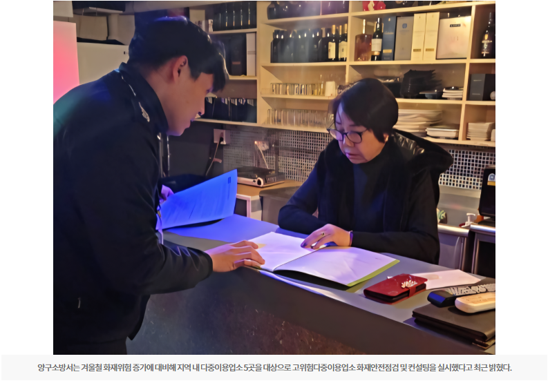 【양구】양구소방서는 겨울철 화재위험 증가에 대비해 지역 내 다중이용업소 5곳을 대상으로 고위험다중이용업소 화재안전점검 및 컨설팅을 실시했다고 최근 밝혔다.