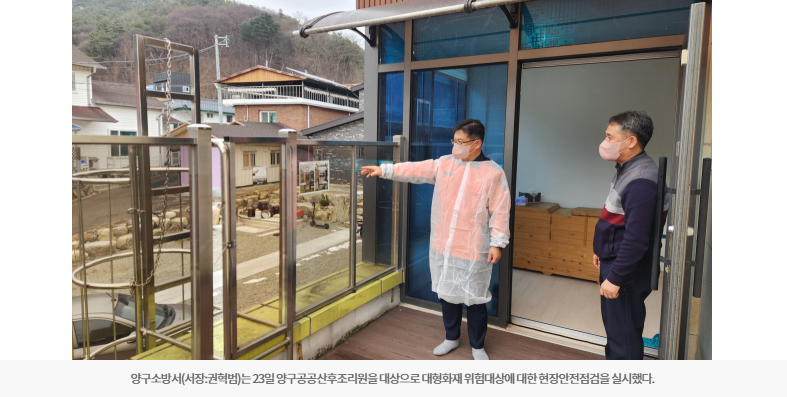 【양구】양구소방서는 23일 양구공공산후조리원을 대상으로 대형화재 위험대상에 대한 현장안전점검을 실시했다.
