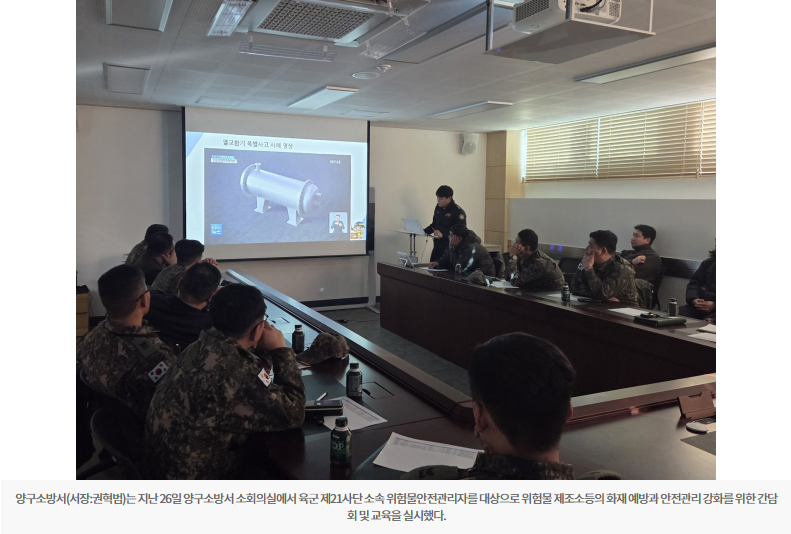 양구소방서(서장:권혁범)는 지난 26일 양구소방서 소회의실에서 육군 제21사단 소속 위험물안전관리자를 대상으로 위험물 제조소등의 화재 예방과 안전관리 강화를 위한 간담회 및 교육을 실시했다.