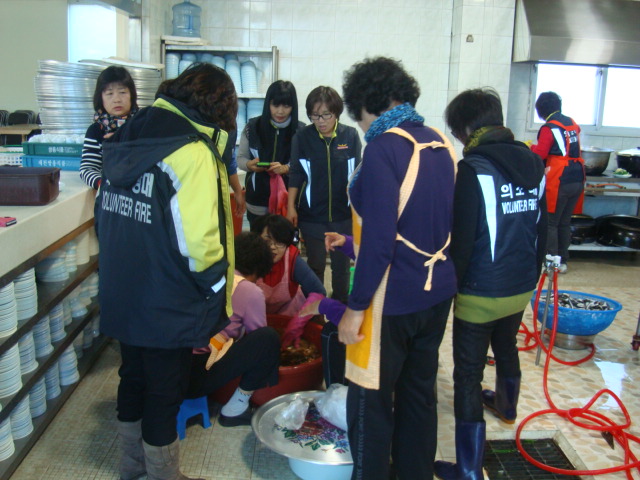 12월 4일 아침 10시부터 주천 복지회관에서 주천여성의용소방대(대장 전금자) 대장님 및 대원 분들이 독거노인 및 불우이웃들을 돕기 위한 반찬만들기에 여념이 없네요.