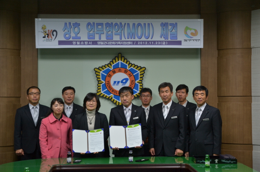 11. 23(금) 오후 2시 소방서 소회의실에서 소방서장, 영월군다문화가족지원센터장 등 관계자가 참석한 가운데 다문화가족 안전문화정착, 안전교육지원 등 생명존중문화 확산을 위한 업무협정을 체결하였습니다.