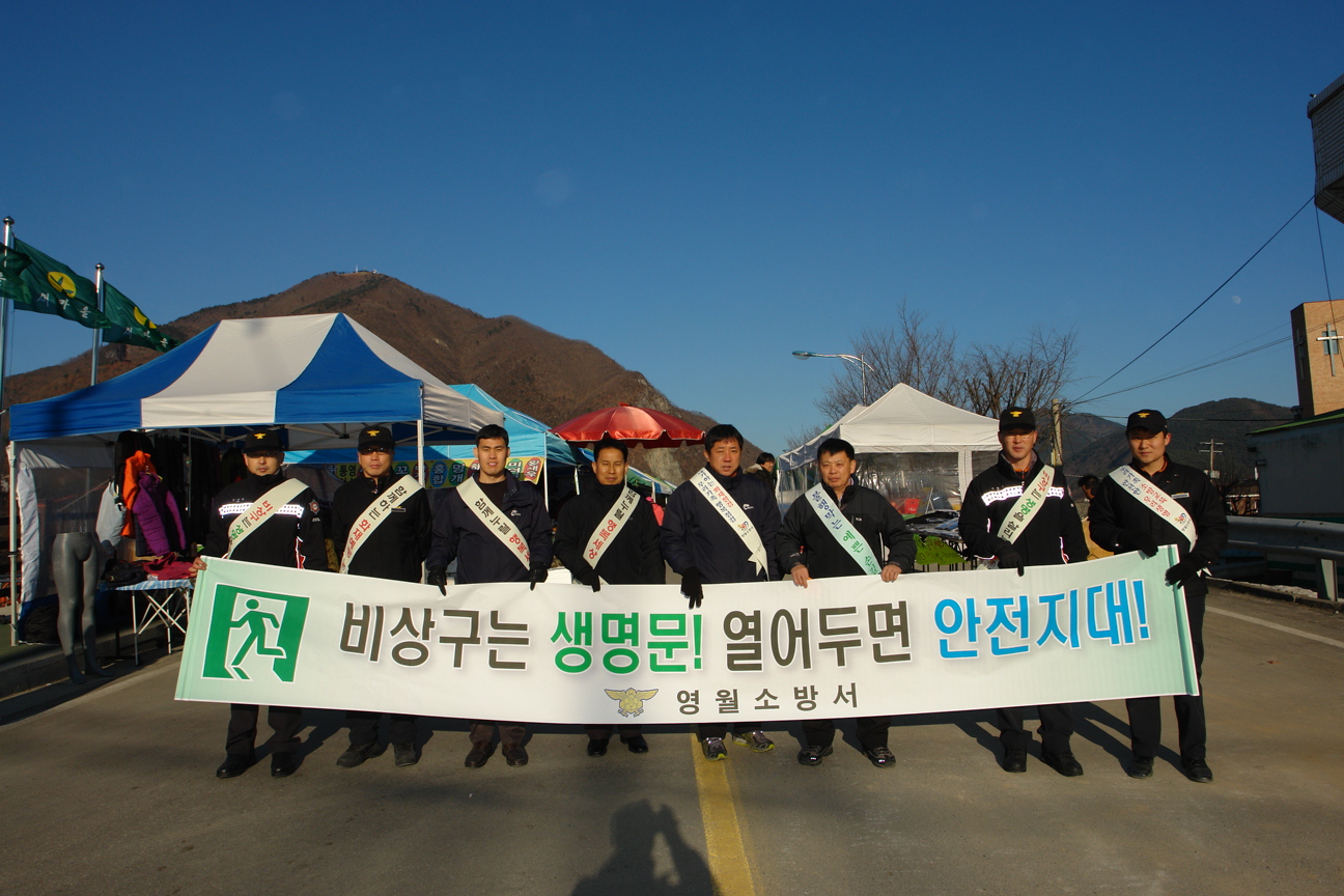 12. 24(월) 오후 3시 관내 민속장, 재래시장, 시외버스터미널 등 주요 다중운집장소에서 소방공무원, 의용소방대원, 유관기관 공무원 등 50여명이 참석한 가운데 비상구 안전관리 홍보를 위한「생명의 문 비상구 안전점검의 날」캠페인을 실시하고 시민들에게 홍보물을 배부했다.