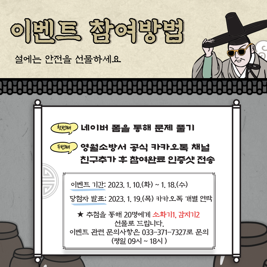 영월소방서는 설 명절을 맞아 안전 선물하기 이벤트를 진행중입니다. 이벤트 참여하고 안전을 선물해보세요~