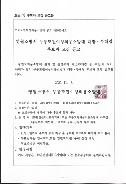 무릉도원 여성의용소방대 대장, 부대장 모집공고문