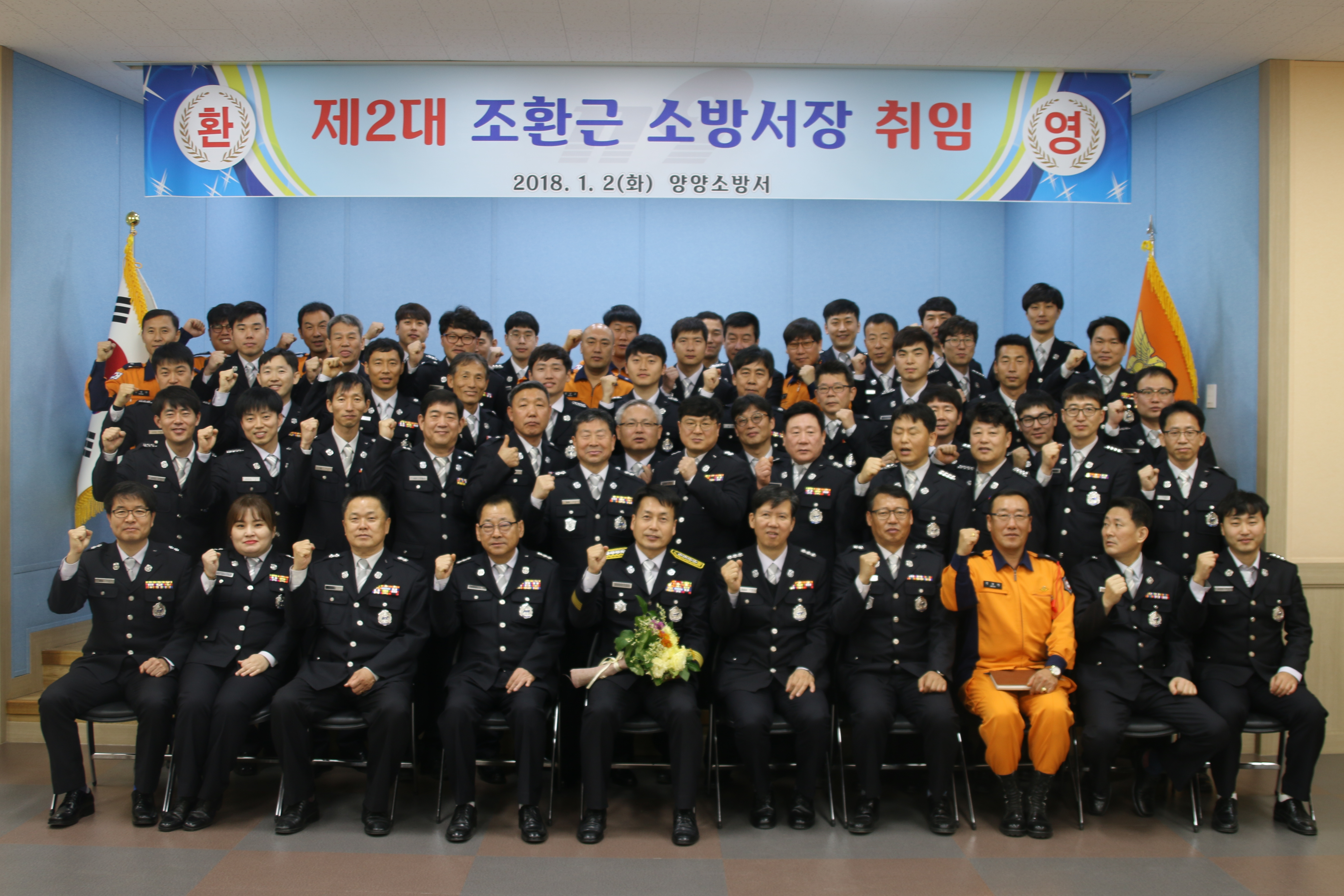 양양소방서(서장 조환근)는 2일 오전 10시 양양소방서 대회의실에서 소방공무원과 의용소방대 등 80여명이 참석한 가운데 제2대 조환근 양양소방서장 취임식 및 무술년 새해 힘찬 출발을 다짐하는 2018년 시무식을 개최했다.