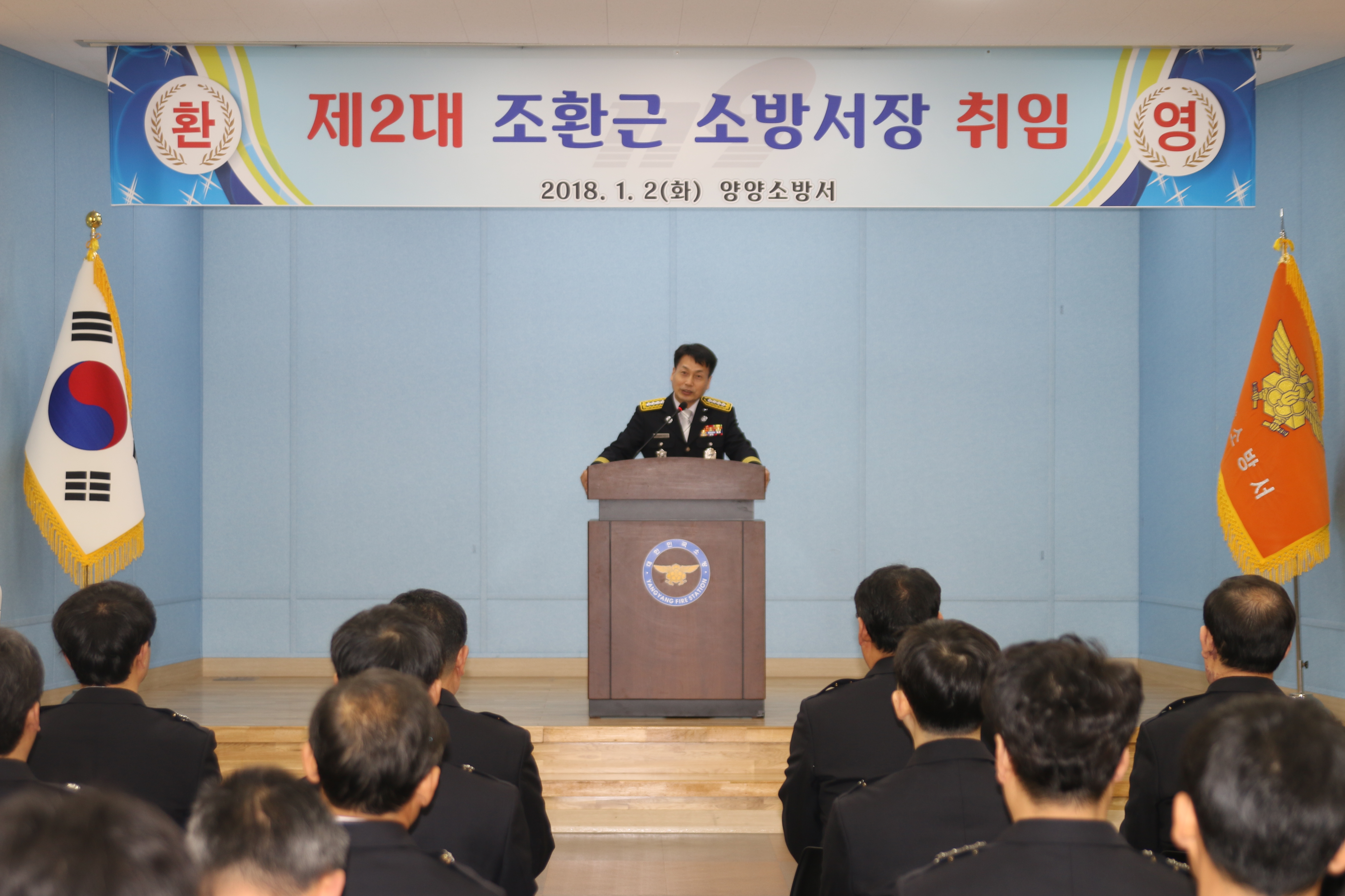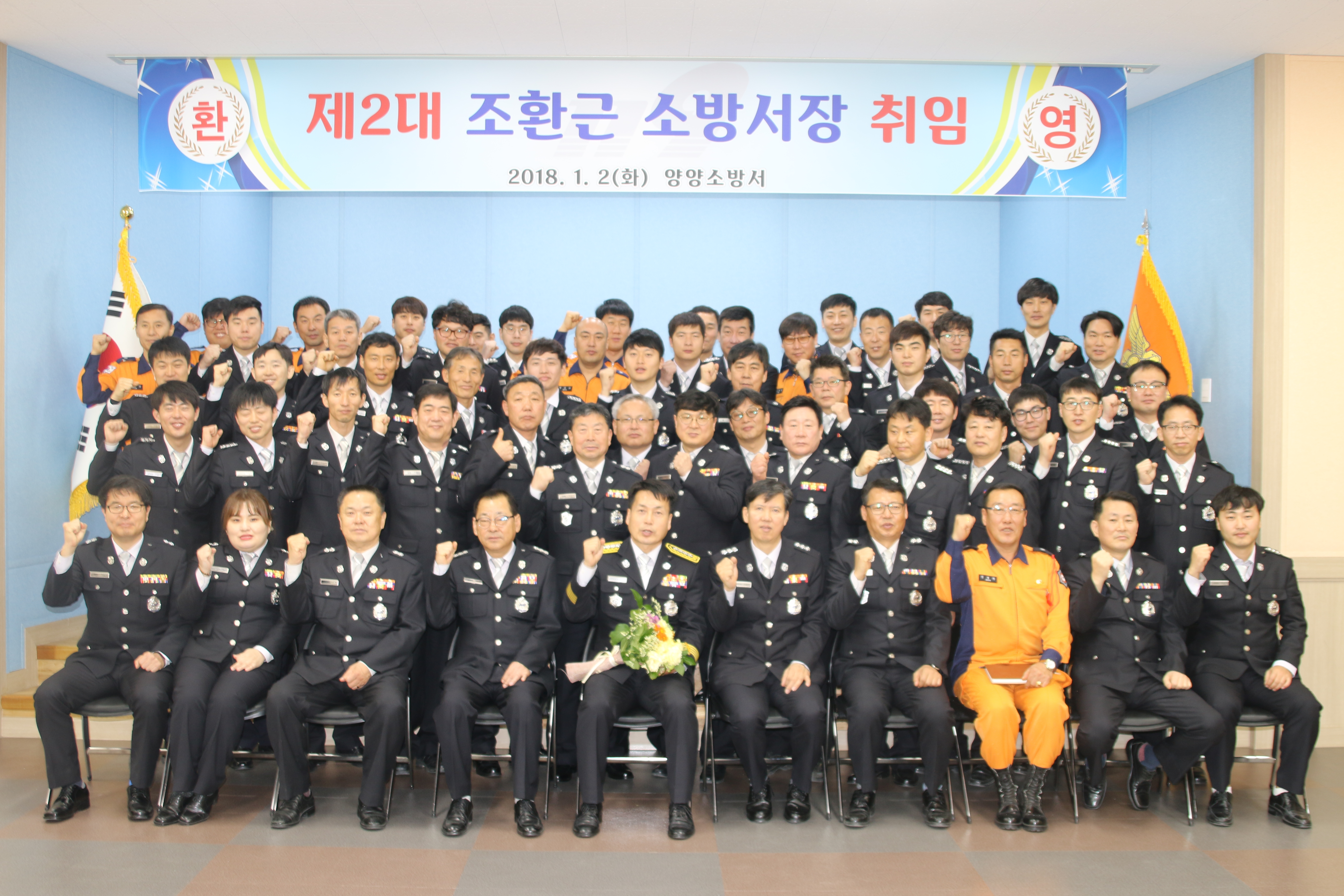양양소방서(서장 조환근)는 2일 오전 10시 양양소방서 대회의실에서 소방공무원과 의용소방대 등 80여명이 참석한 가운데 제2대 조환근 양양소방서장 취임식 및 무술년 새해 힘찬 출발을 다짐하는 2018년 시무식을 개최했다.